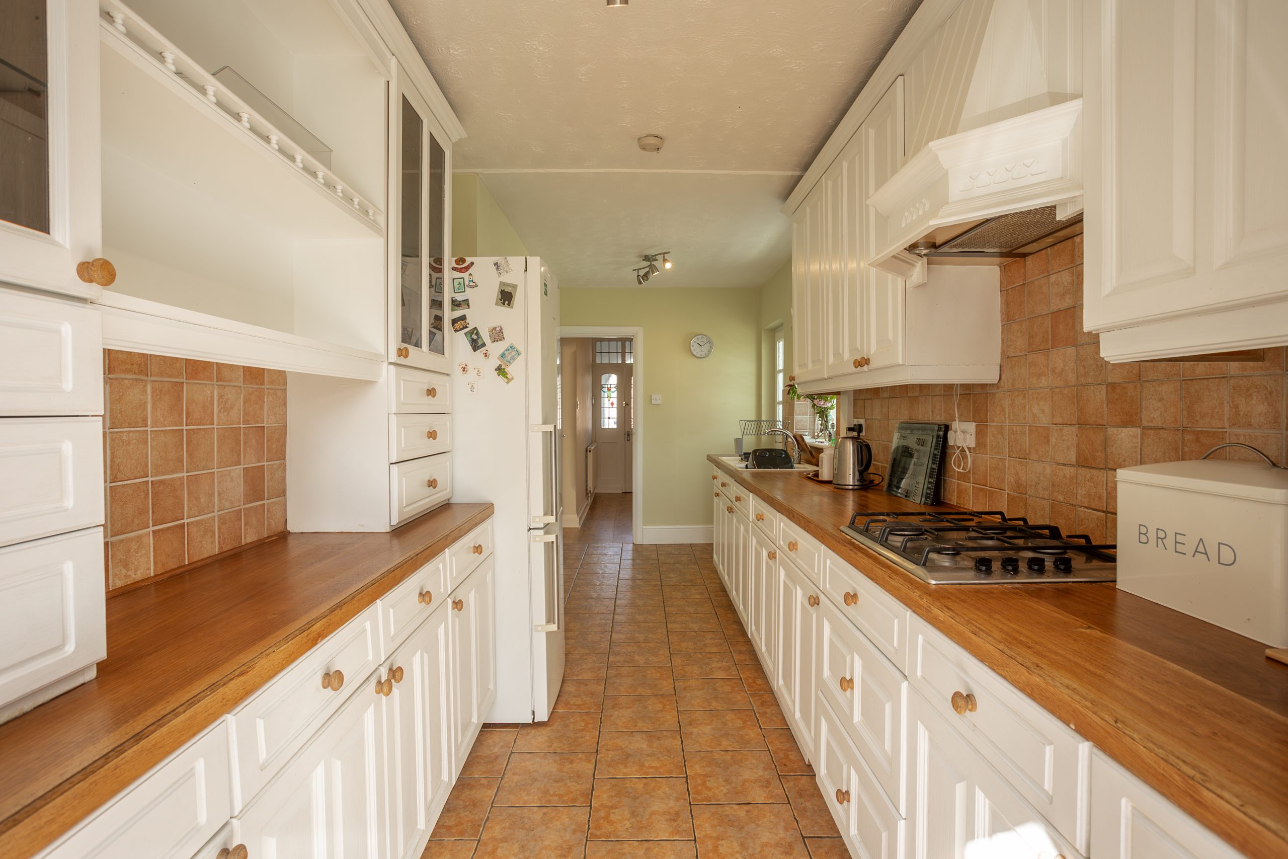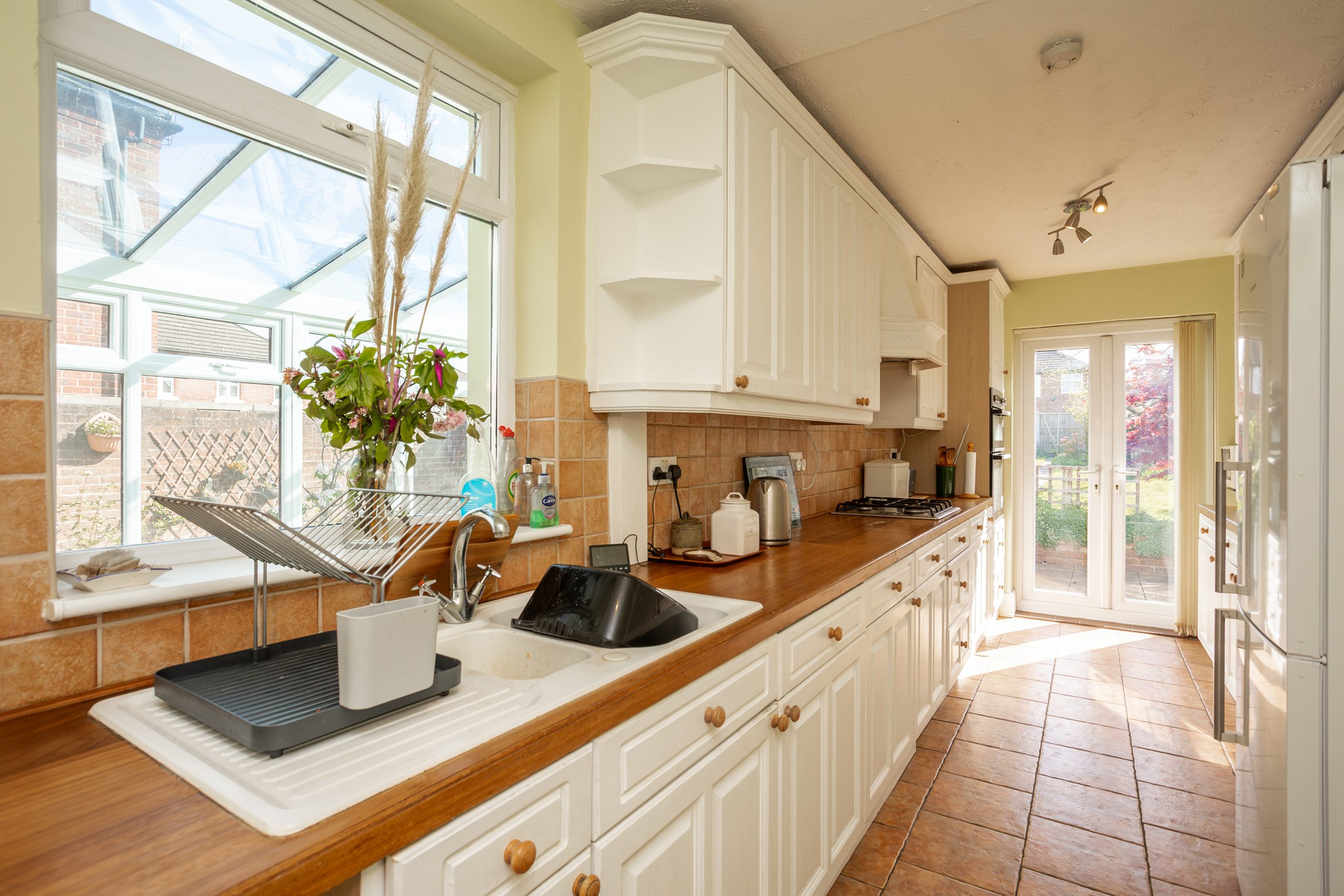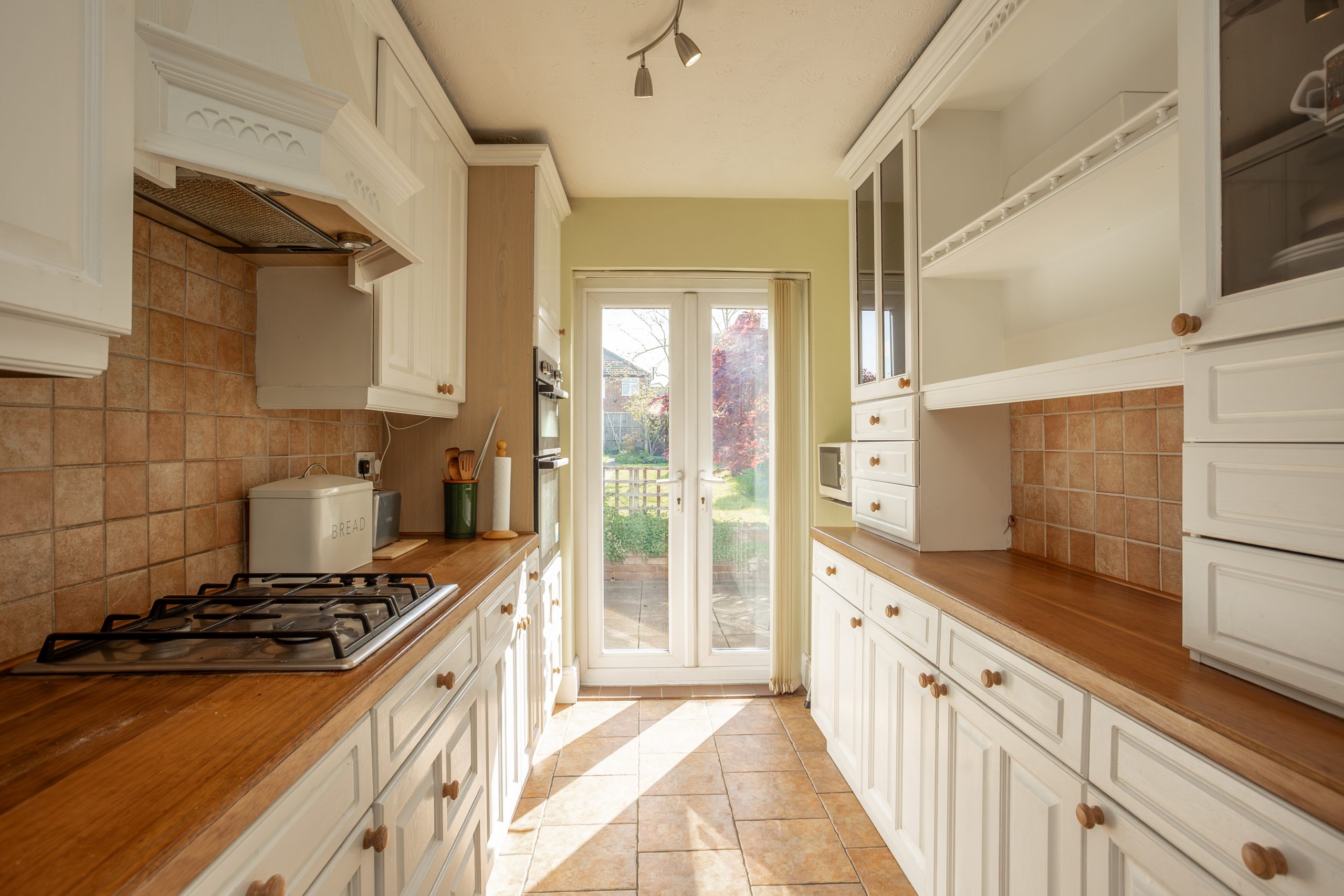 Positioned to the rear left, the kitchen is fitted with a range of white base and wall units complemented by wooden worktops and distinctive orange tiled flooring. It includes an integrated double oven, gas hob, sink, and space for a fridge freezer. Patio doors from the kitchen provide direct access to the rear garden.