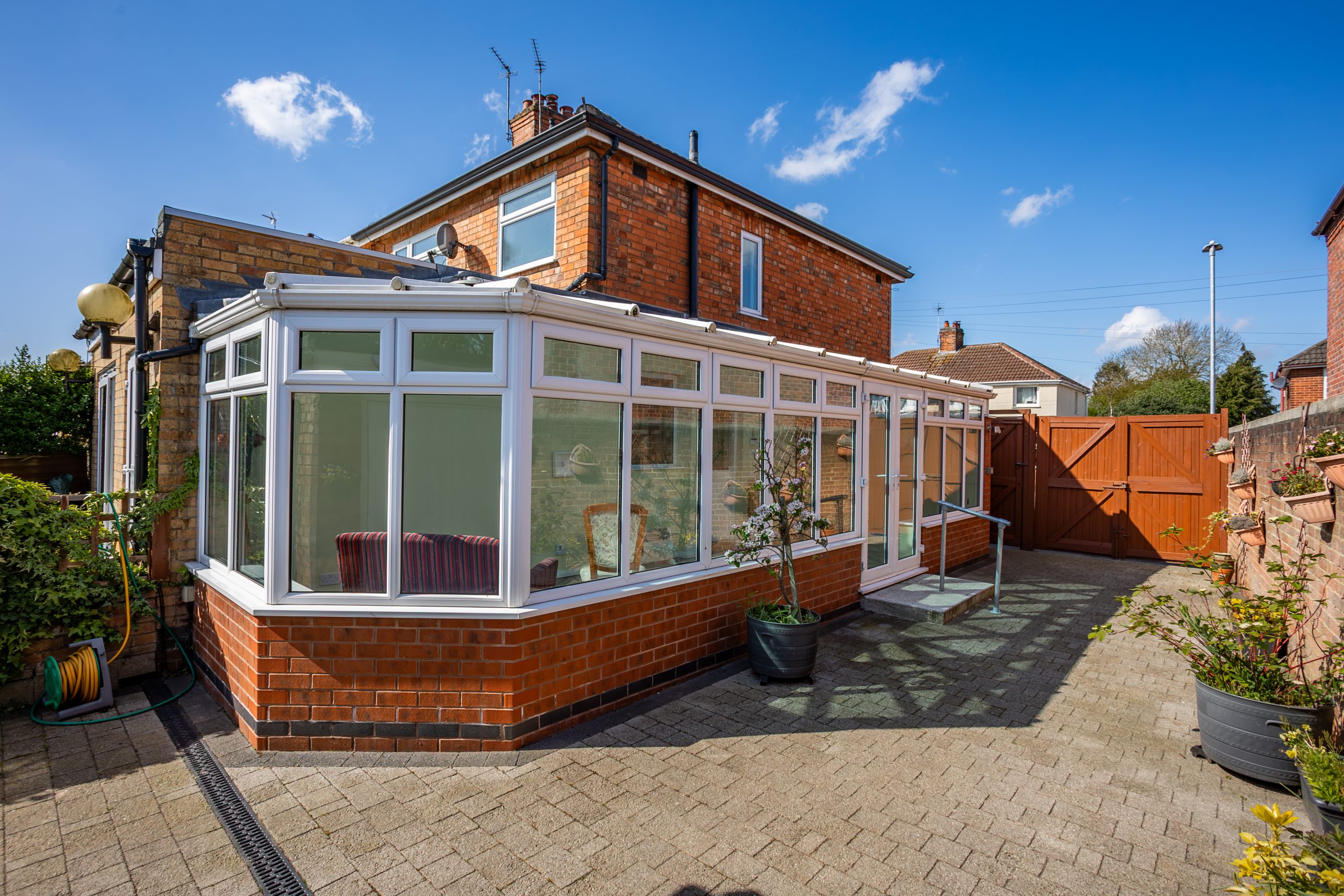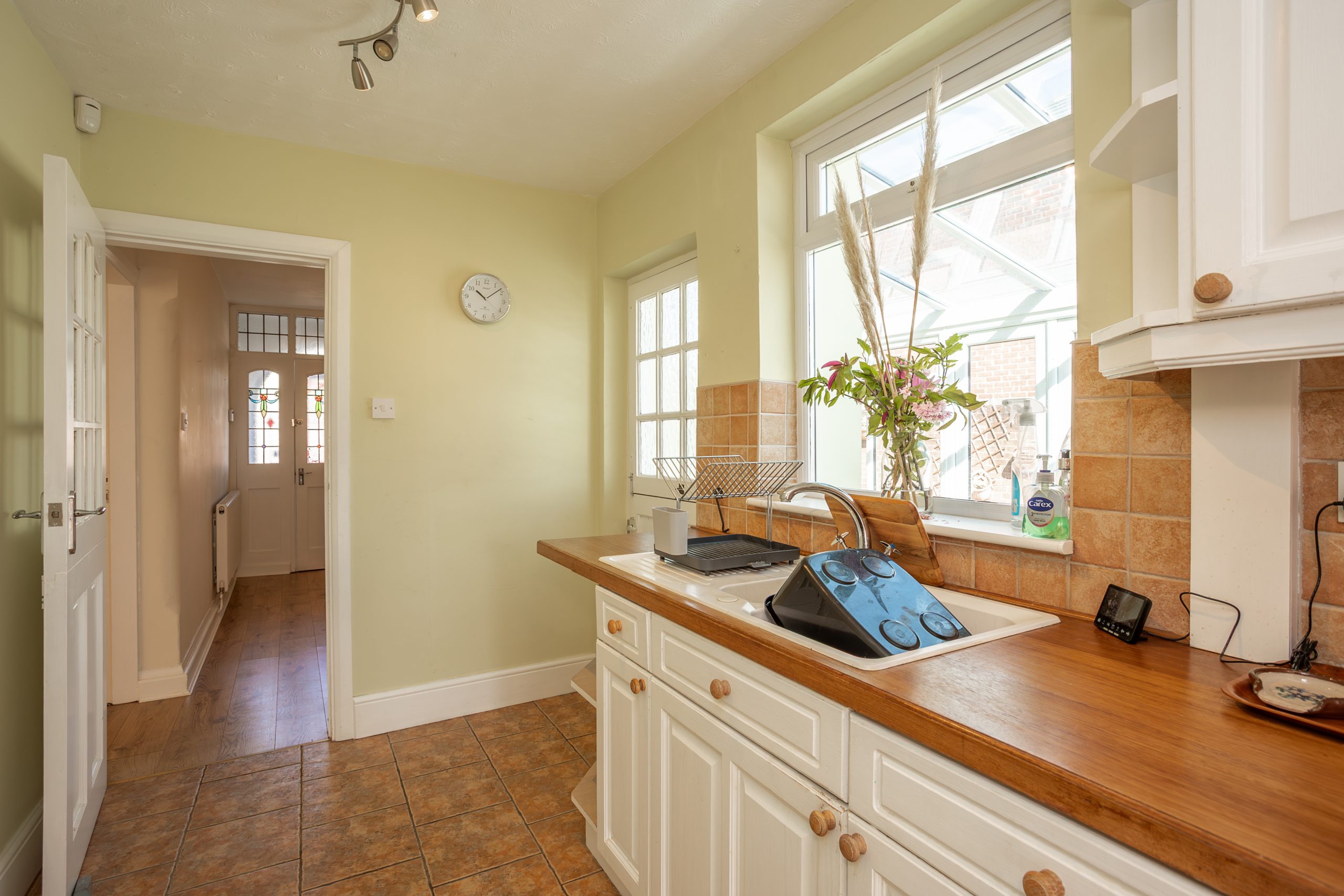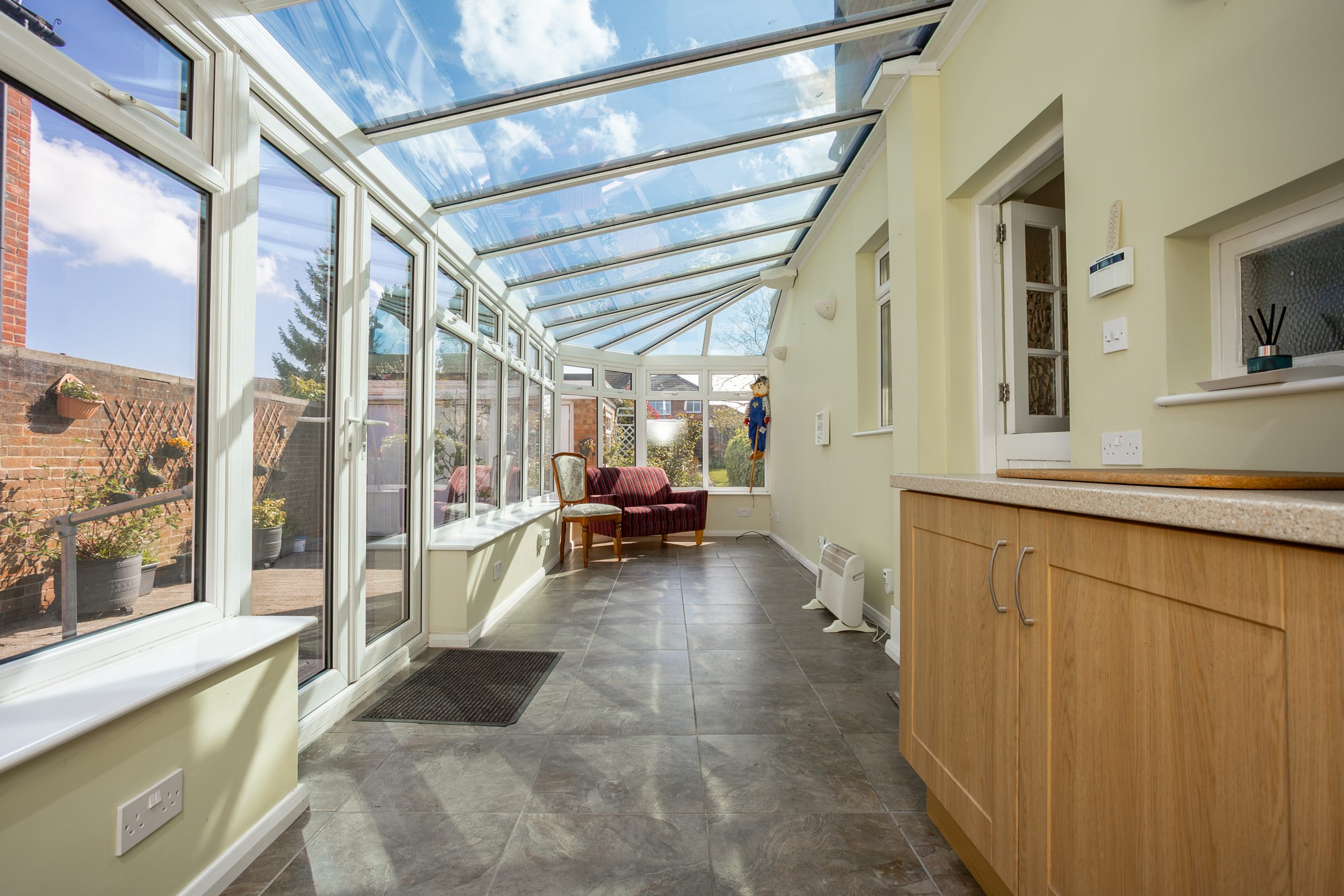 Leading off the kitchen, a door opens into a generously sized conservatory with a half-built wall and modern grey tiled flooring. This additional living space enjoys views over the garden and also offers direct access outside, making it a perfect spot for relaxing or entertaining.