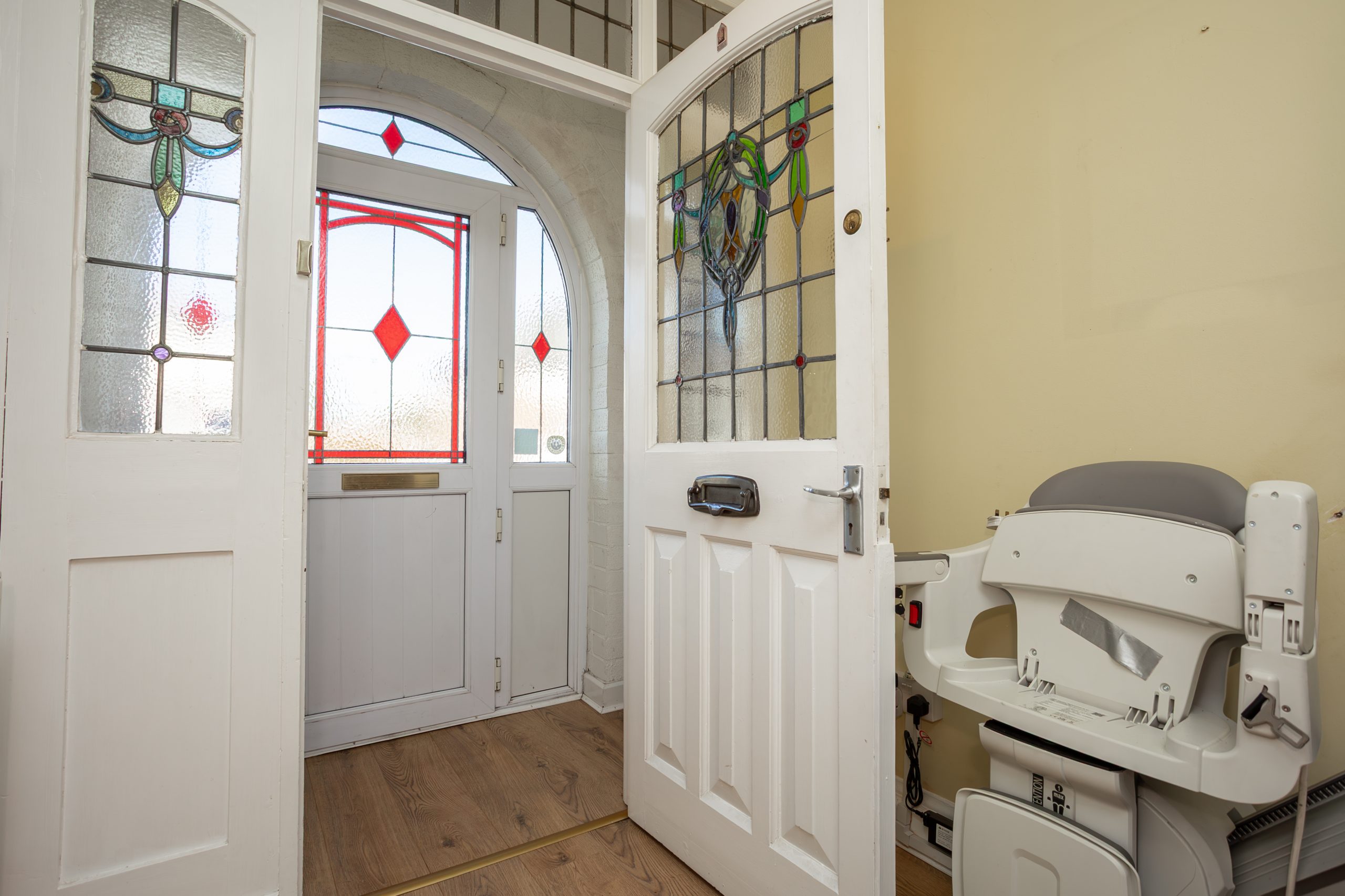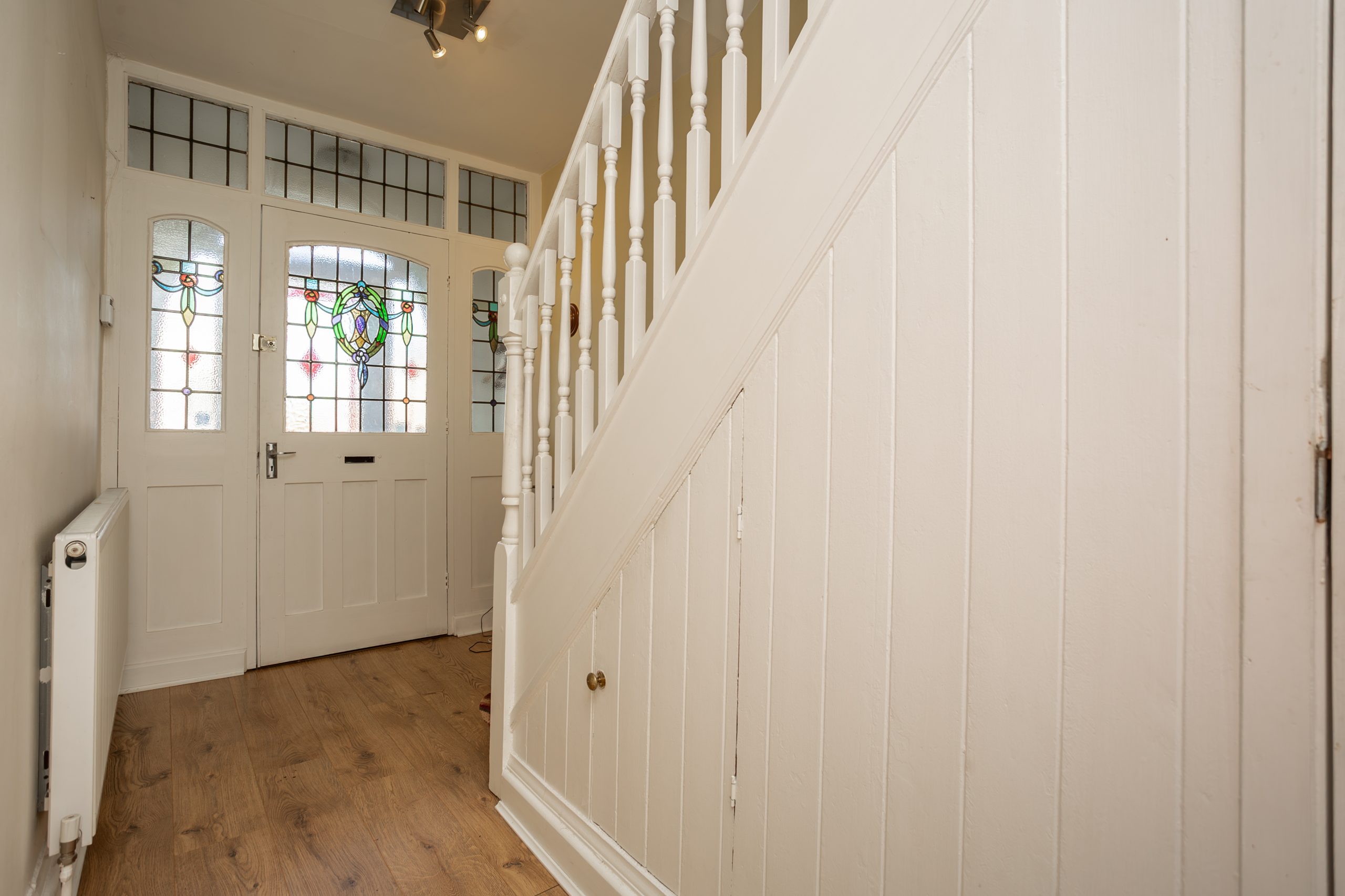 The property is entered via a charming front porch featuring attractive stained glass windows, leading into a welcoming hallway. The hallway is fitted with wood-effect laminate flooring and provides access to the main living areas, with a staircase rising to the first floor on the left. There is also the benefit of useful understairs storage and a convenient downstairs WC.