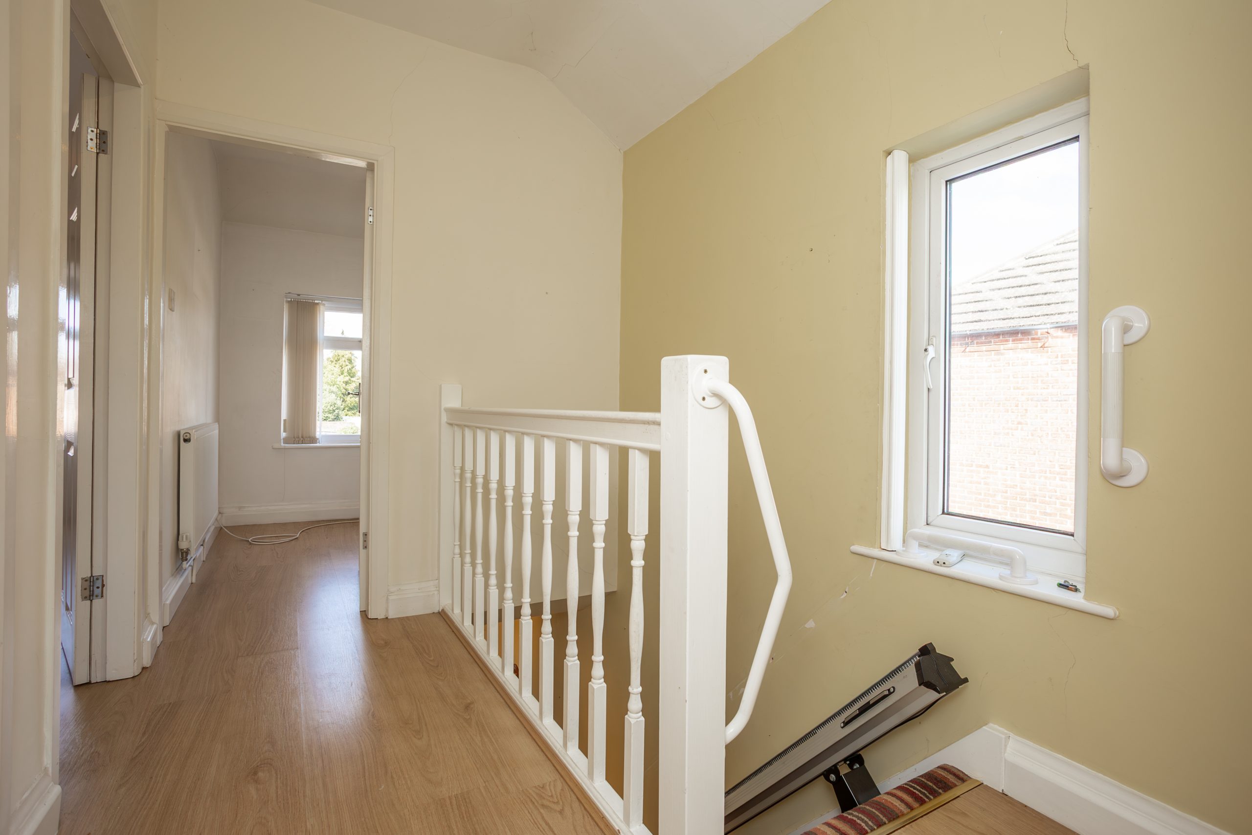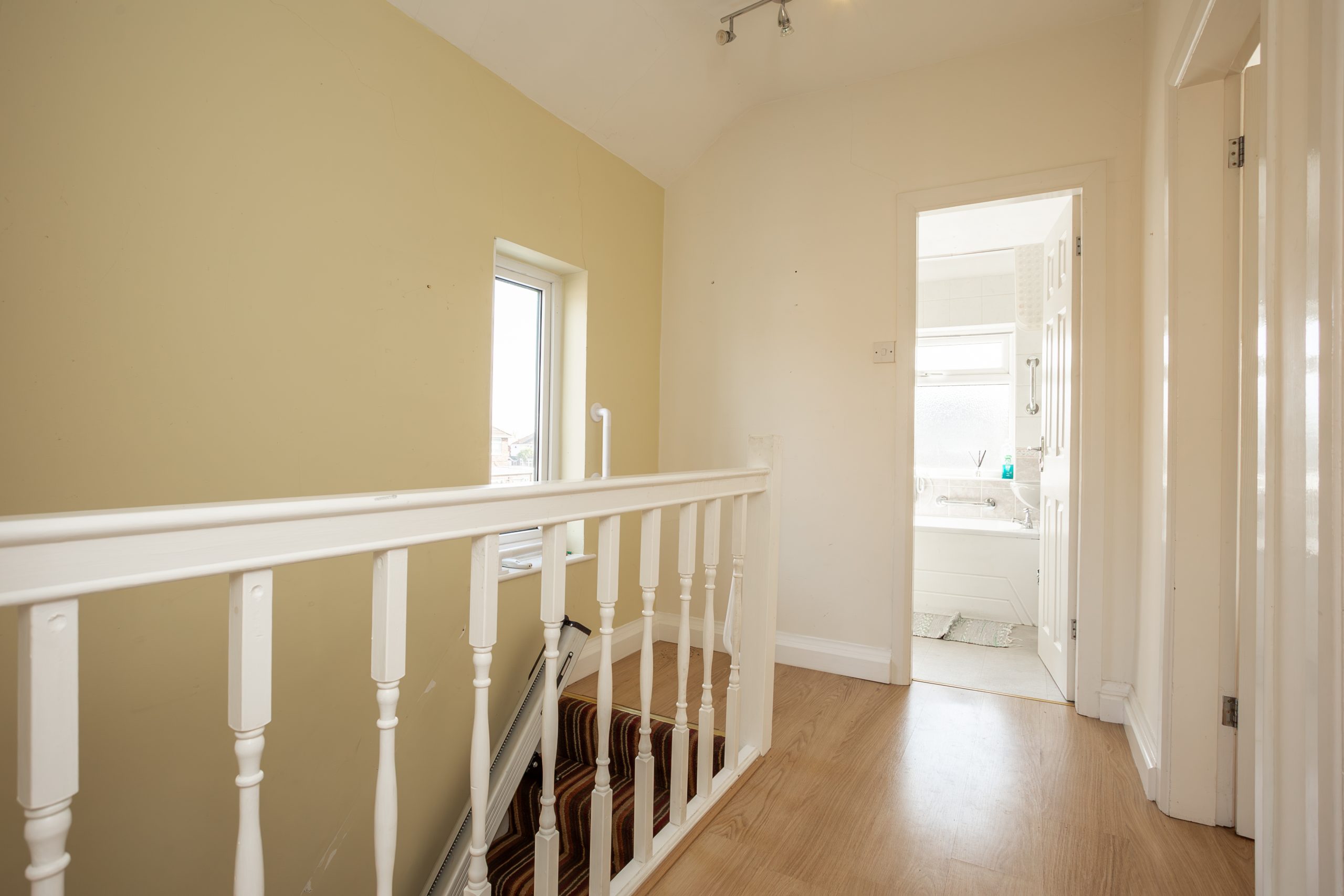 Stairs with a striped carpet, complemented by a white handrail and banister, lead to the first-floor landing. The upstairs accommodation is well-presented throughout, with all rooms benefiting from wood-effect laminate flooring, creating a clean and cohesive finish.