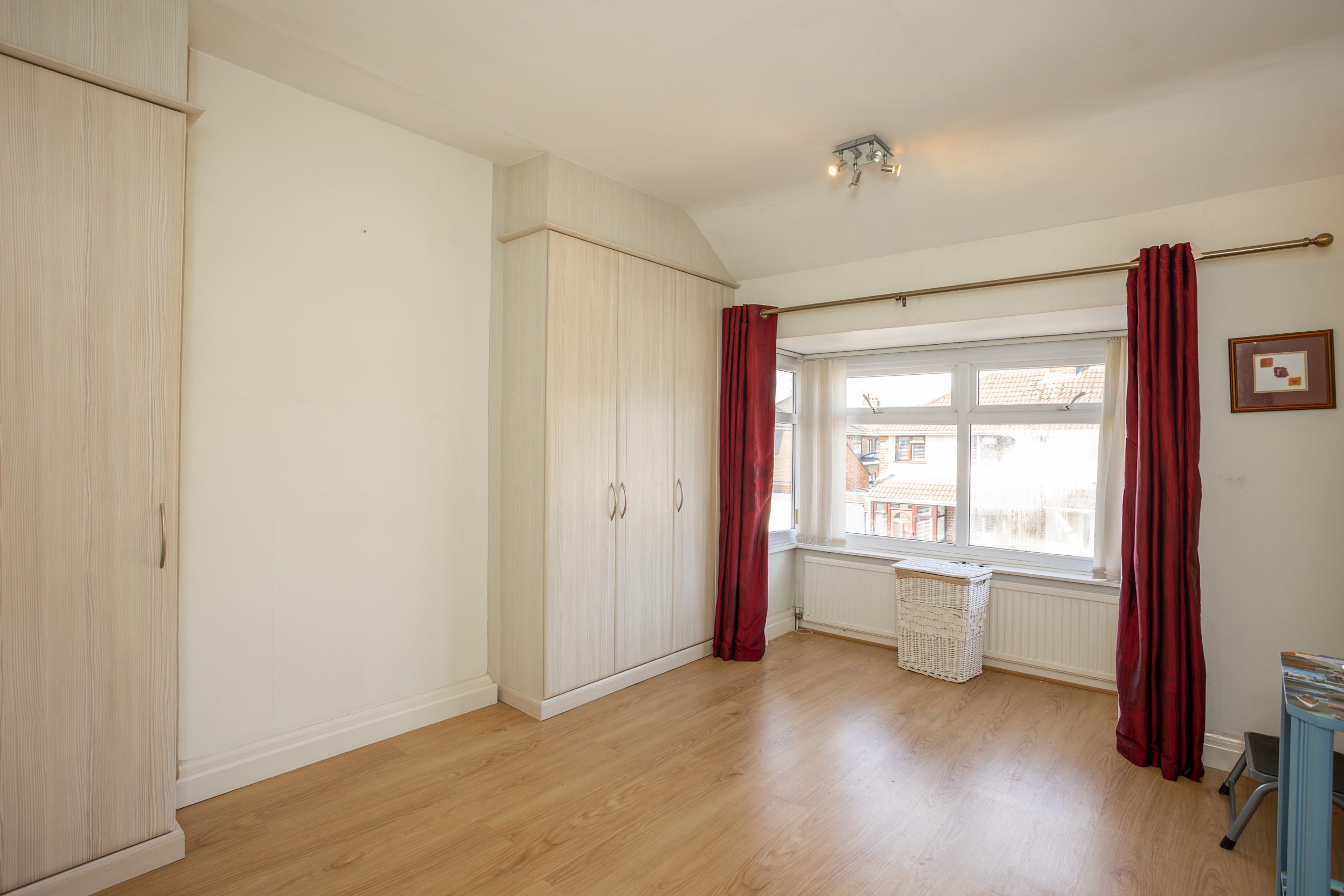 The primary bedroom is situated at the front of the property and features a large bay window, allowing for plenty of natural light, along with built-in wardrobes.
