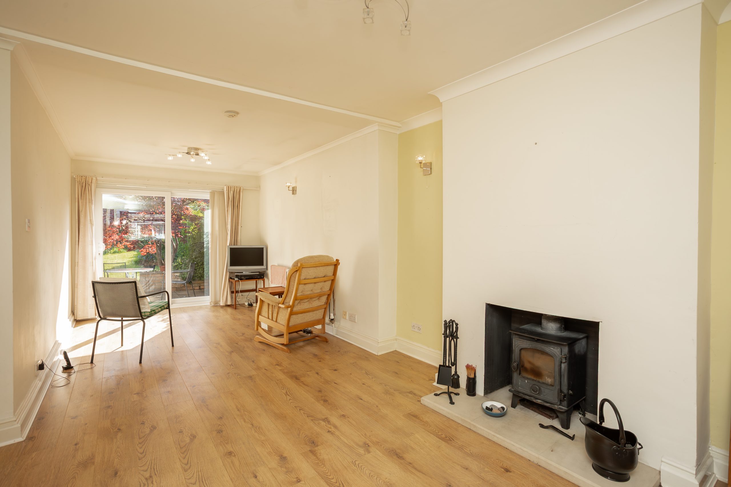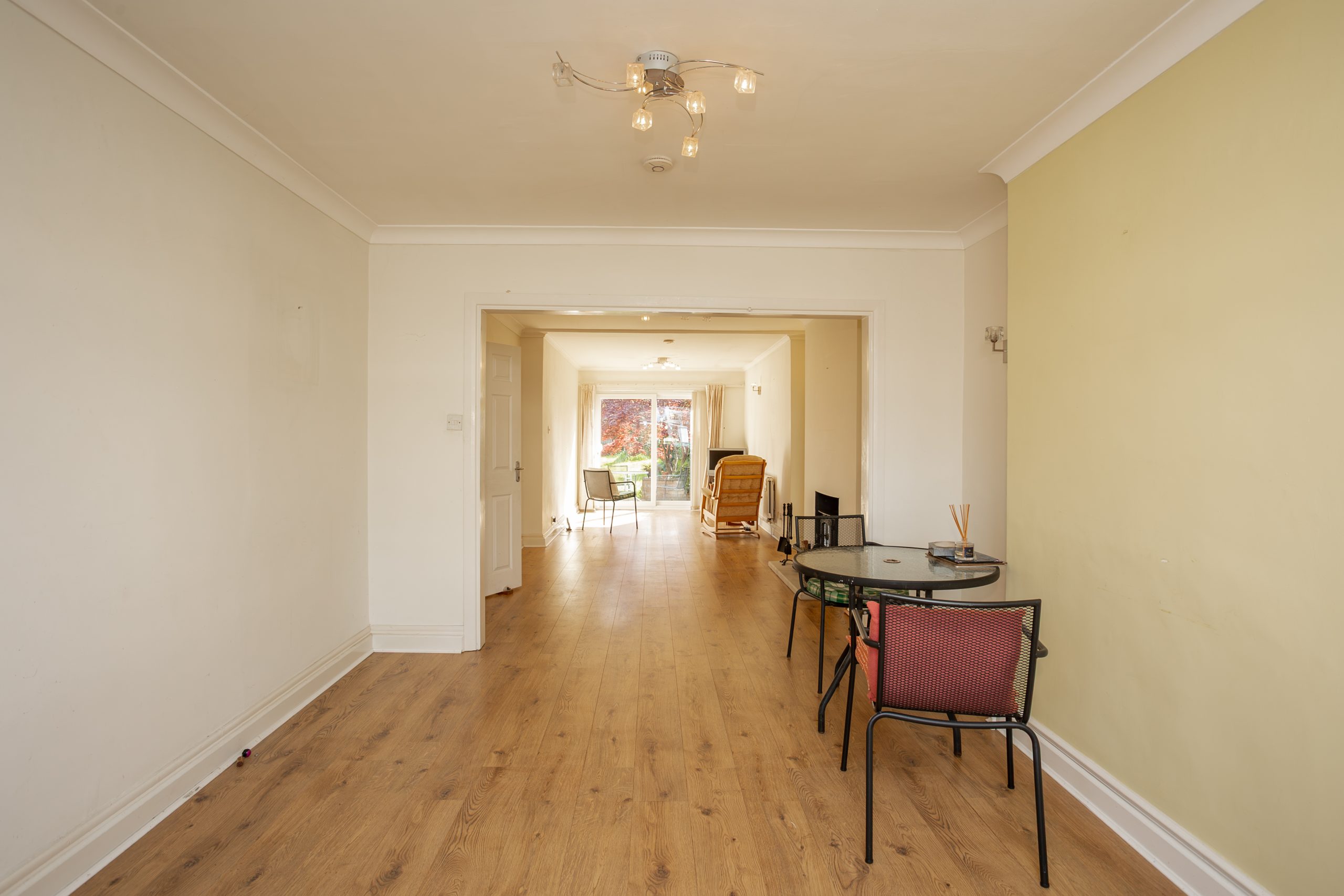 To the right-hand side of the property is a spacious open-plan living and dining area, extending the full length of the home. This bright and versatile space features wood-effect laminate flooring throughout, a bay window to the front elevation, and patio doors to the rear garden, allowing for plenty of natural light. A central feature log burner creates a cosy focal point, making this an ideal space for both relaxing and entertaining.