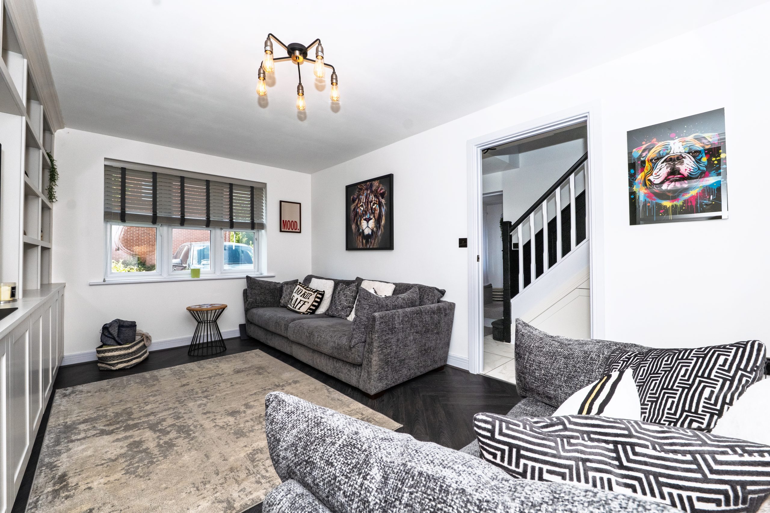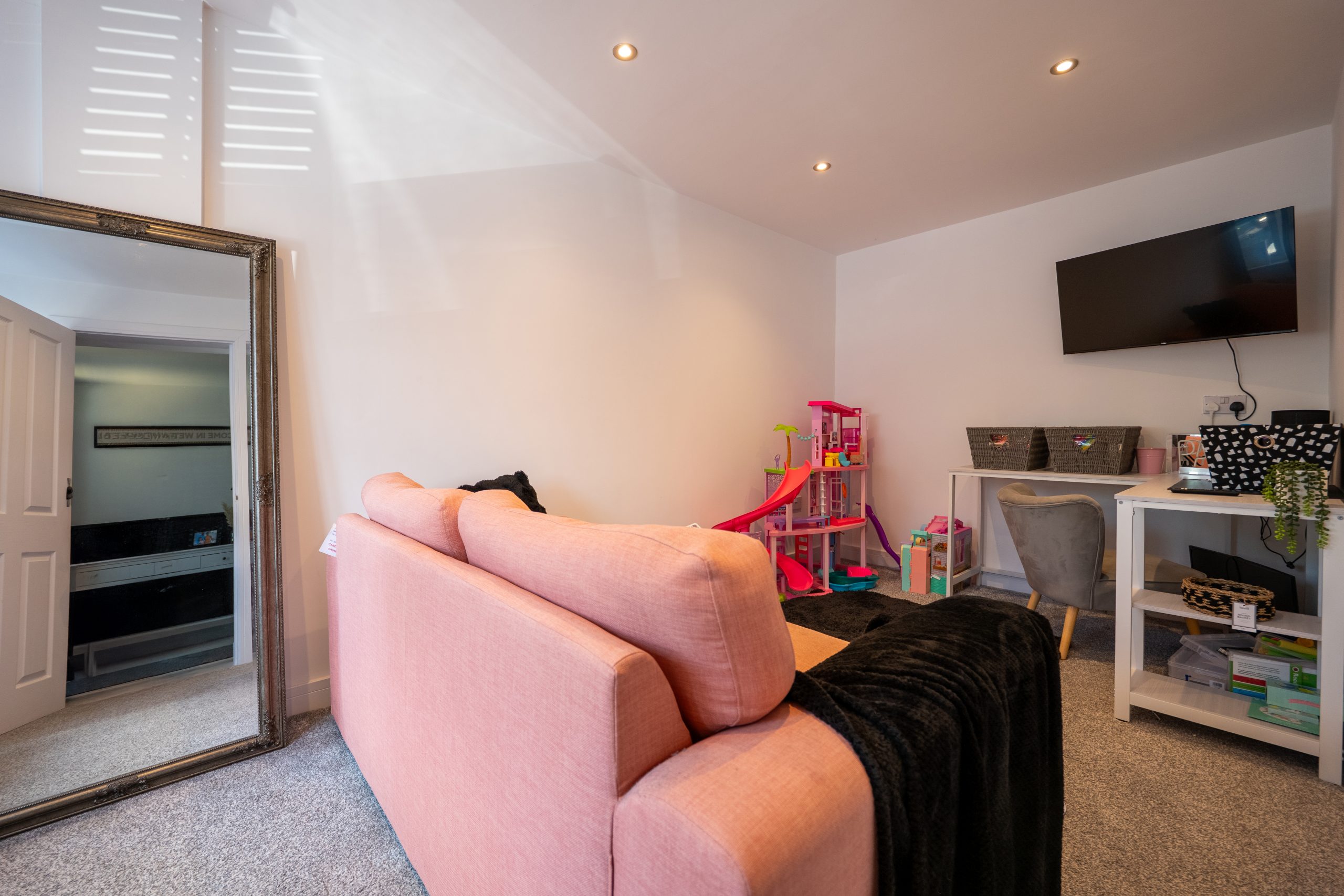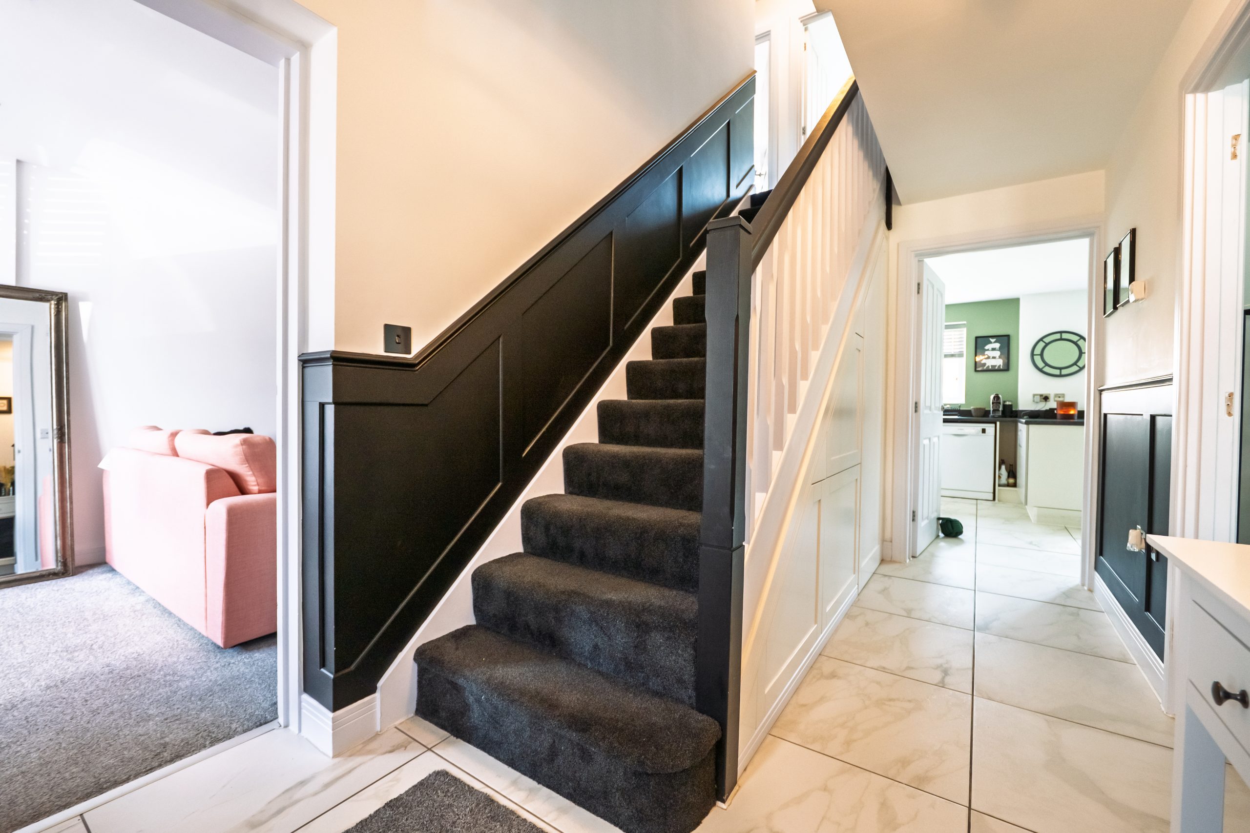 Upon entering the property, you’re welcomed into a stylish entrance hall, finished with elegant marble-effect tiled flooring that flows throughout the entire ground floor, creating a sleek and cohesive feel. Wall panelling adds a refined touch, while practical understairs storage helps keep the space tidy. To the left of the hallway is the converted garage, now a cosy and functional snug or home office. This versatile room is carpeted for comfort and enhanced by recessed spotlights, making it ideal for work or relaxation.