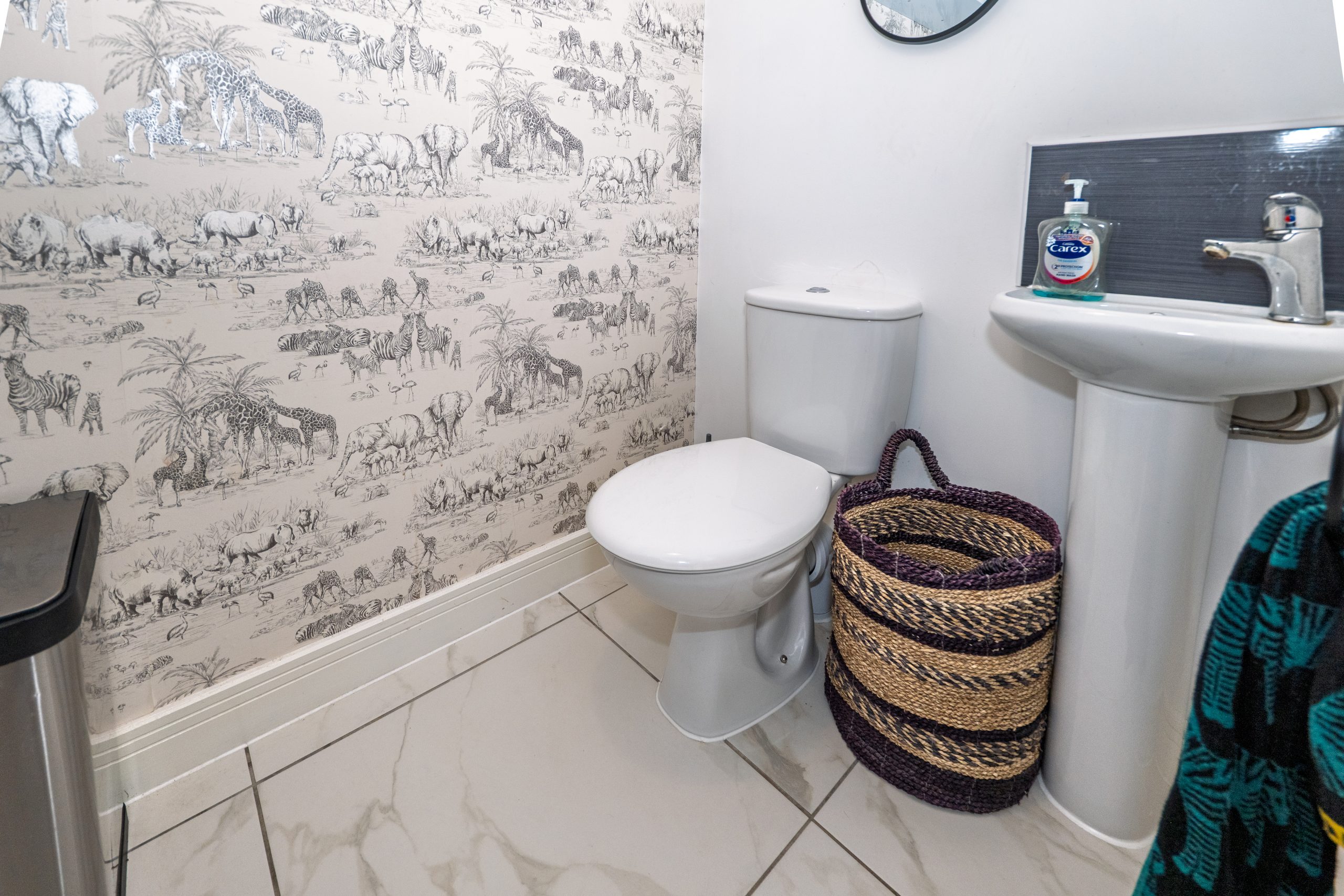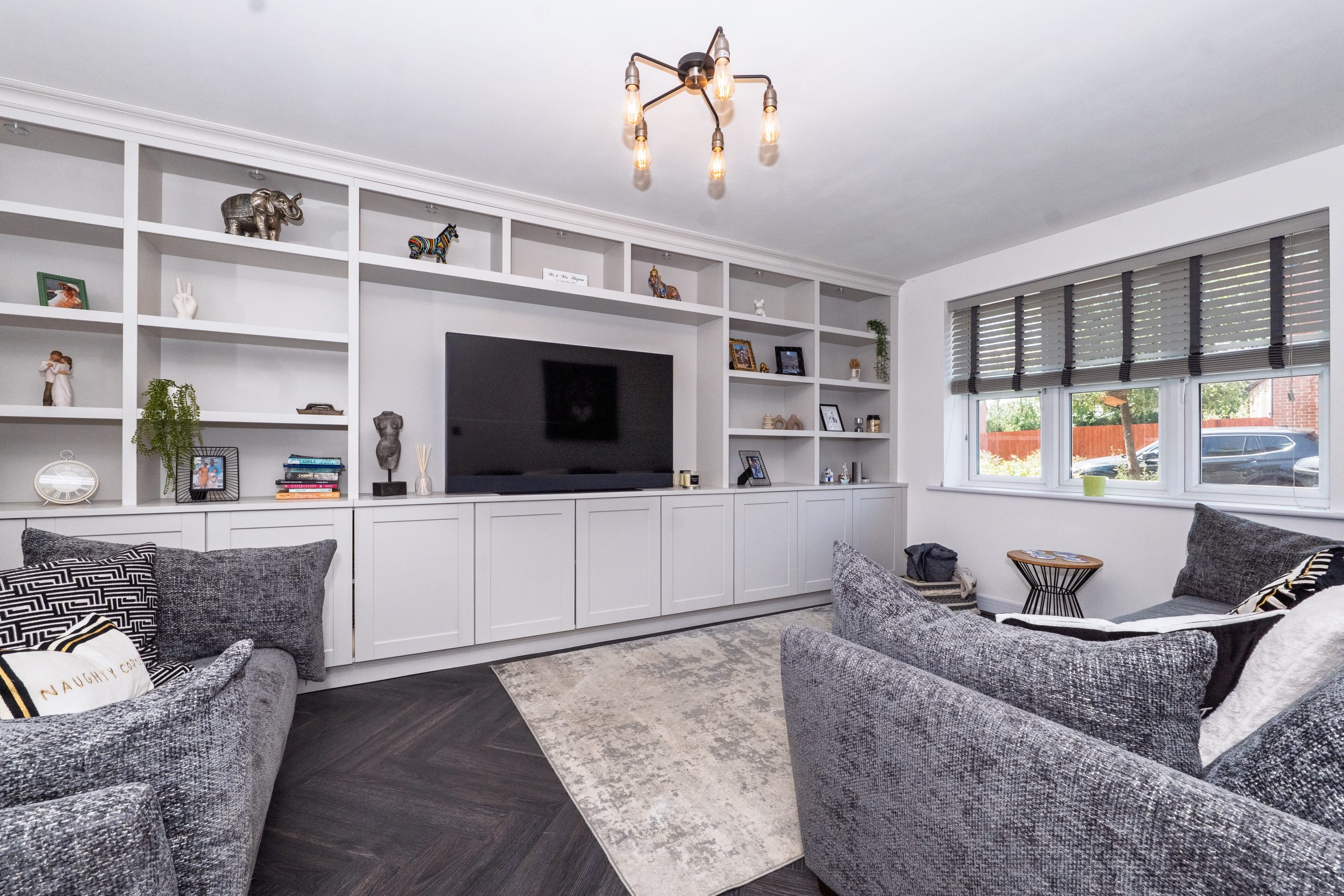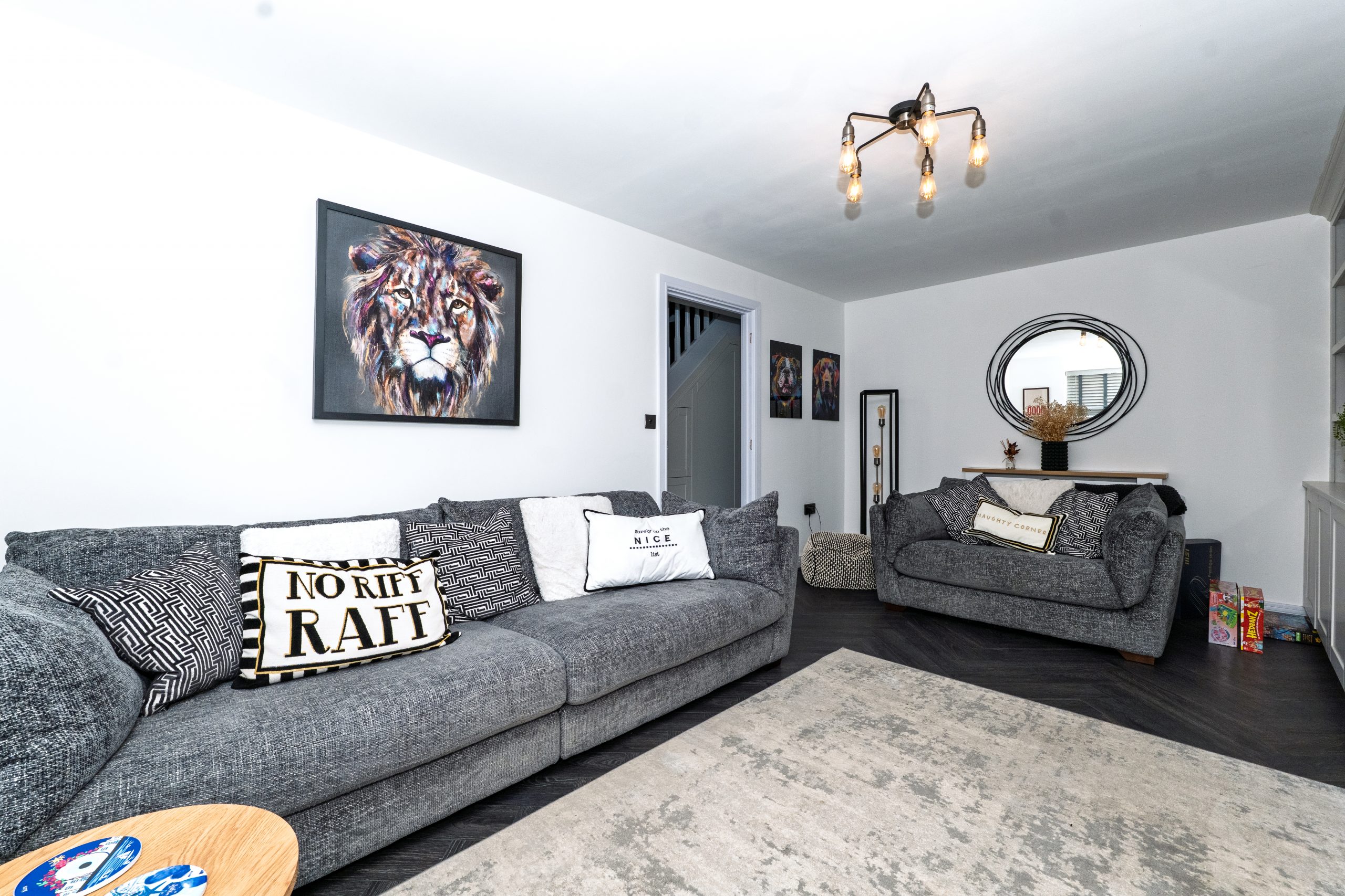 Continuing through the hallway, you’ll find the main lounge, which features beautiful parquet-style wooden flooring and a bespoke built-in media wall, perfect for modern family living. At the rear of the home, the open-plan kitchen and dining area offers a stylish and practical space for both everyday life and entertaining. The kitchen is fitted with an integrated electric oven and hob, and provides designated space for a dishwasher, washing machine, and tumble dryer. Patio doors lead out from the dining area into the landscaped garden, filling the room with natural light. A spacious and contemporary downstairs WC completes the ground floor, offering excellent convenience for both residents and guests.