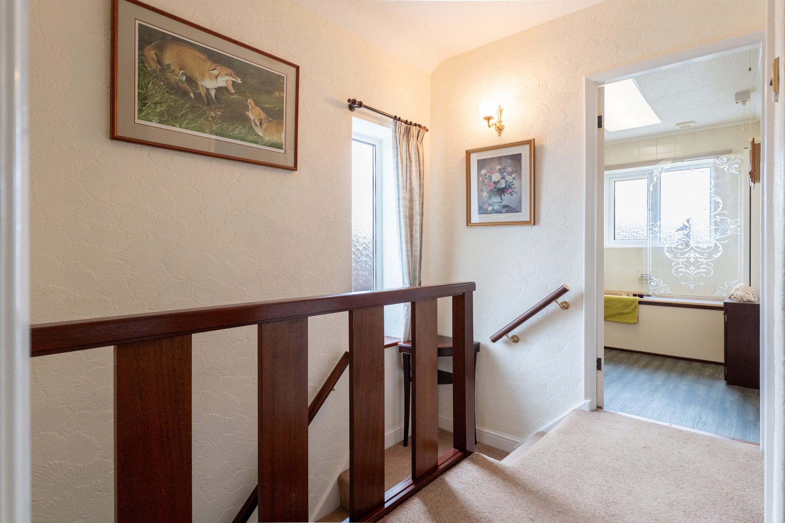 The kitchen, positioned at the rear of the home, benefits from a window overlooking the garden and a ceiling skylight that enhances the natural light. It offers a range of white gloss base and wall units with complementary butcher block worktops, tiled flooring and splashbacks, space for appliances, and convenient side access to the garage and covered carport.