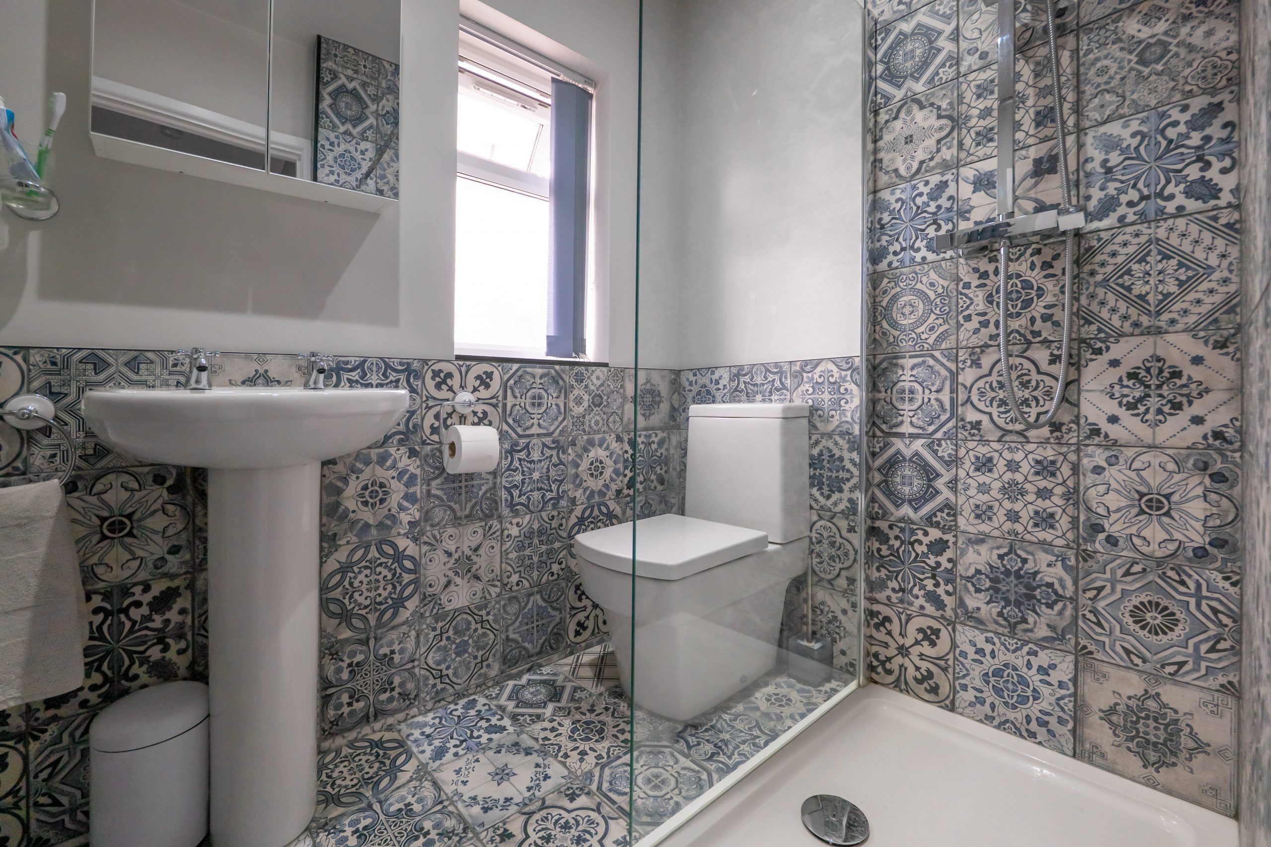 A staircase from the hallway leads to the first-floor landing. The primary bedroom is located at the front of the house, while bedroom two, a double room, is situated at the rear alongside bedroom three. From the landing, there is access to a refitted family shower room with a WC, pedestal wash basin, and heated towel rail.