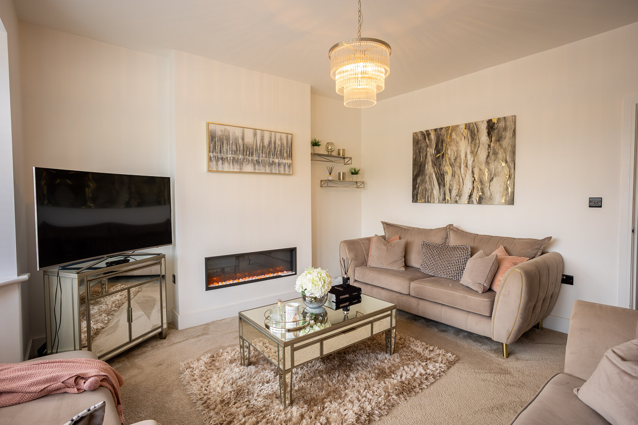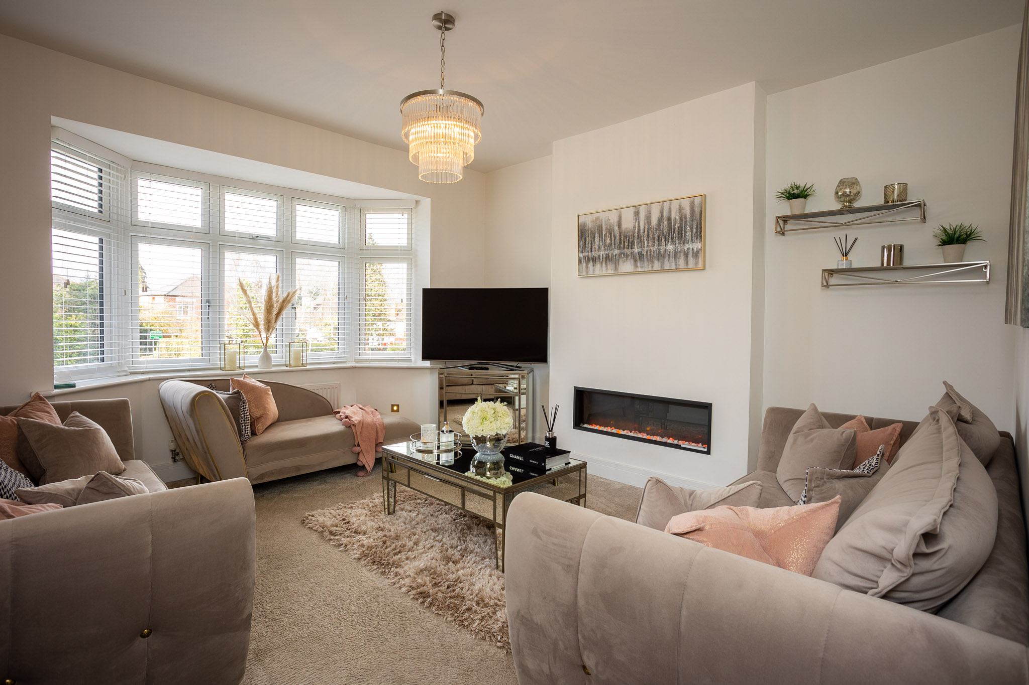 The property is entered into via a welcoming, tiled, entrance hallway, which provides access to the ground floor accommodation and garaging. The impressive dining kitchen, with underfloor heating has been fitted with a range of contemporary units with Quartz worktop and mirrored splashback which wrap around the central island. Full height floor to ceiling windows with further bi-fold doors flood the space in natural light. Further features includes, integrated Neff ovens and hob, fridge freezer and dishwasher. There is ample dining space for both formal and informal entertaining within the kitchen area. The uniquely created champagne bar adds a further touch of glamour to this beautiful space with bespoke glass doors, mirrored tiling, further built in cupboards and drinks fridge, truly making this a elegant space to entertain. The utility room is fitted with a range of contemporary cabinets which compliment the kitchen design, with space for a washing machine and dryer. Downstairs cloakroom/W.C with ample storage for coats and shoes.