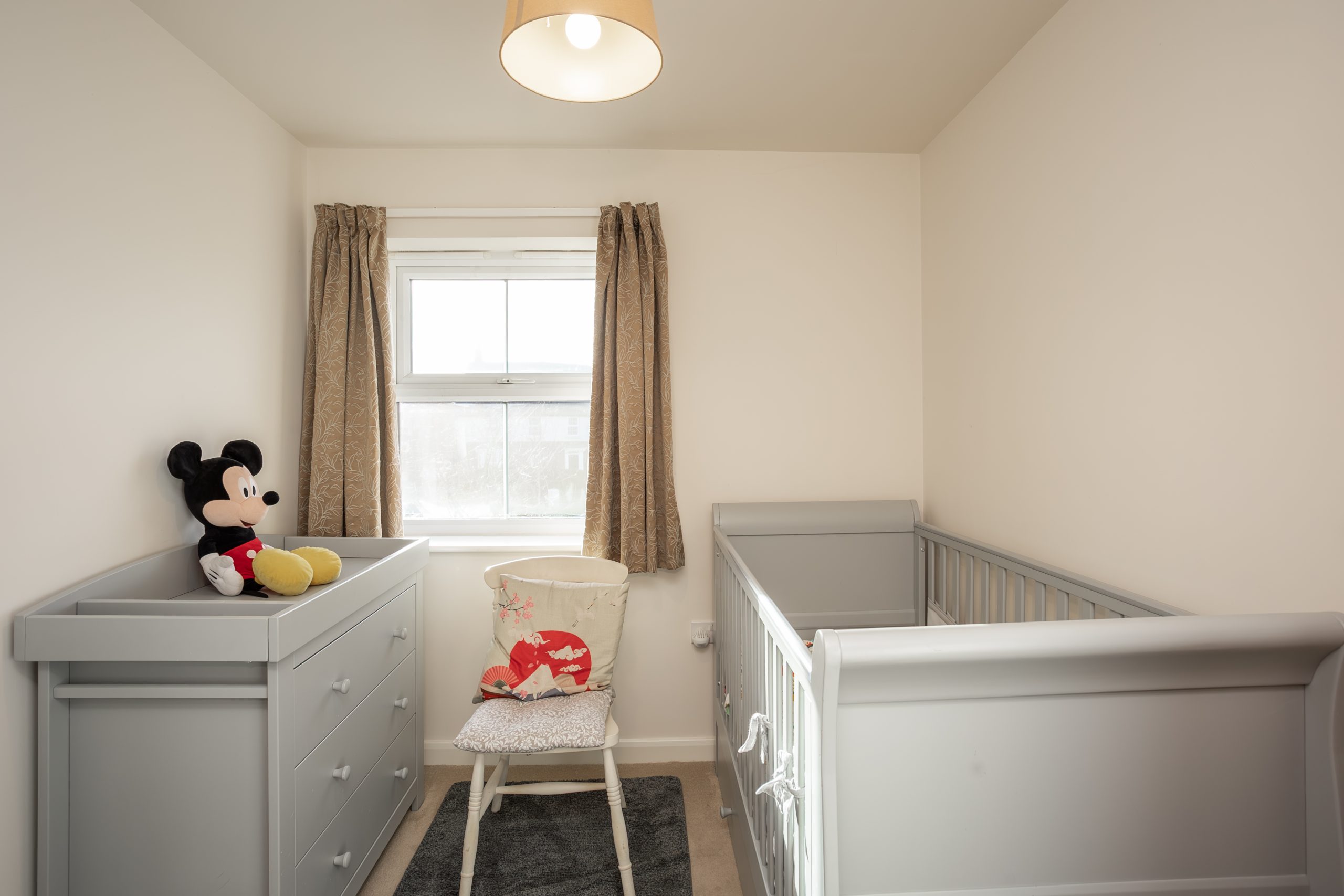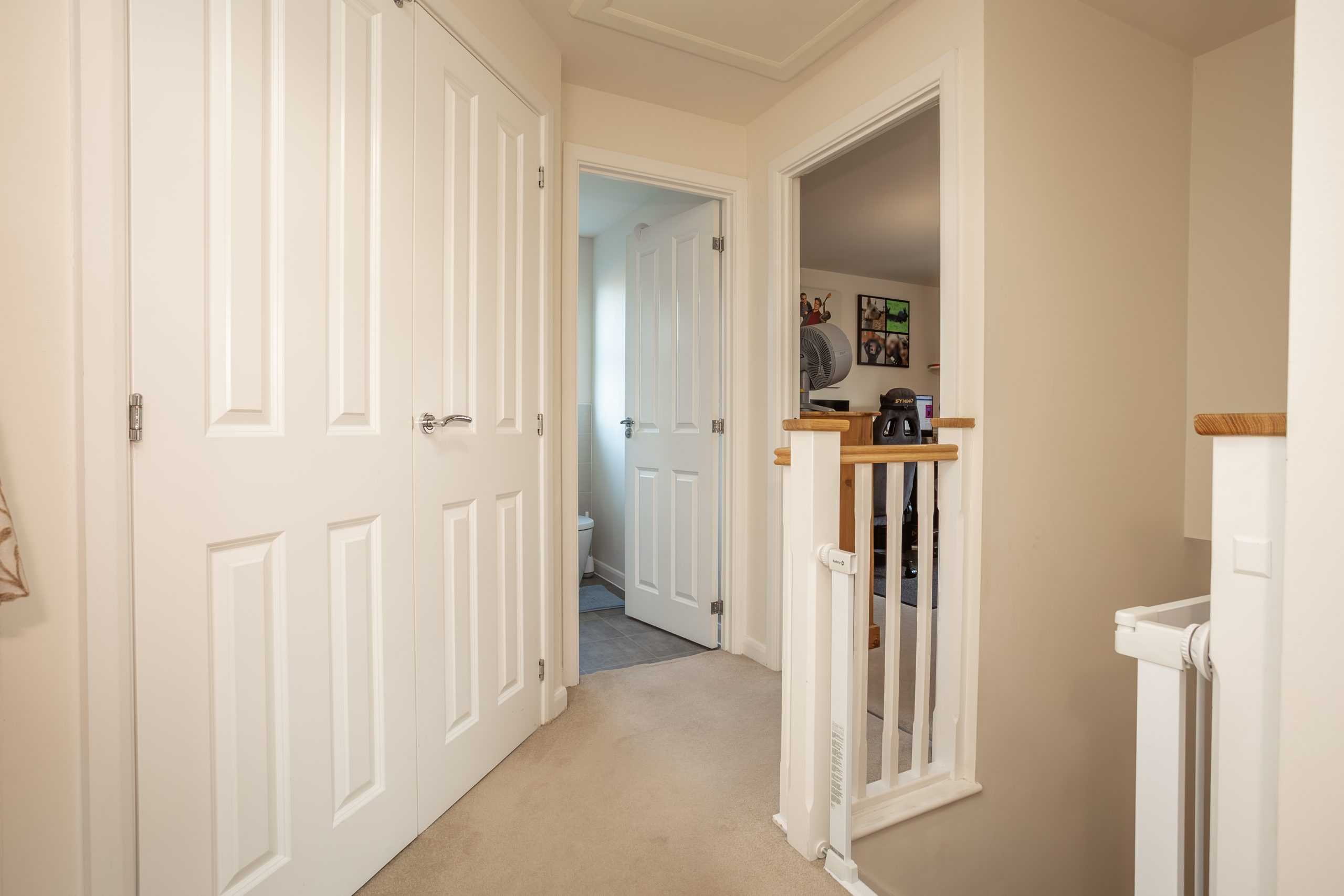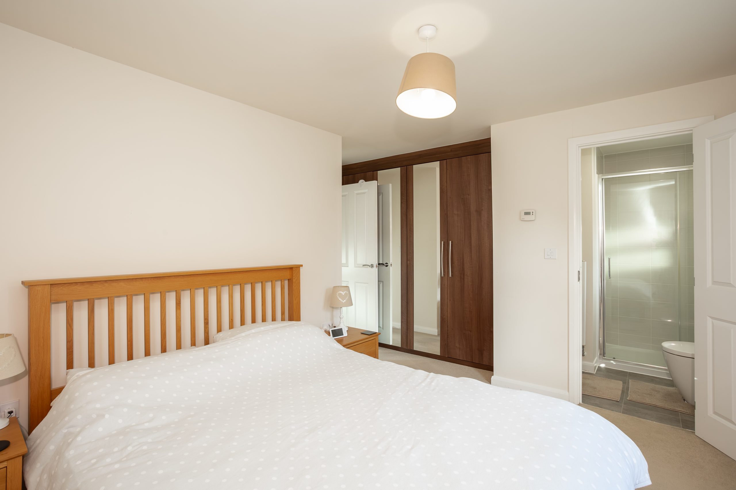 Upstairs, the home continues to impress with three well-proportioned bedrooms. The primary bedroom benefits from its own ensuite shower room, complete with a modern white suite, towel rail, and built-in wardrobes, all arranged in a bright and practical layout. Bedroom two, also a double, enjoys a front-facing window and a useful built-in cupboard. Bedroom three is a generous single, offering flexibility as a child’s room, guest bedroom, or home office. Completing the first floor is the family bathroom, fitted with a contemporary three-piece white suite including a bath with overhead shower and screen. Fully tiled, it presents a clean and modern aesthetic.