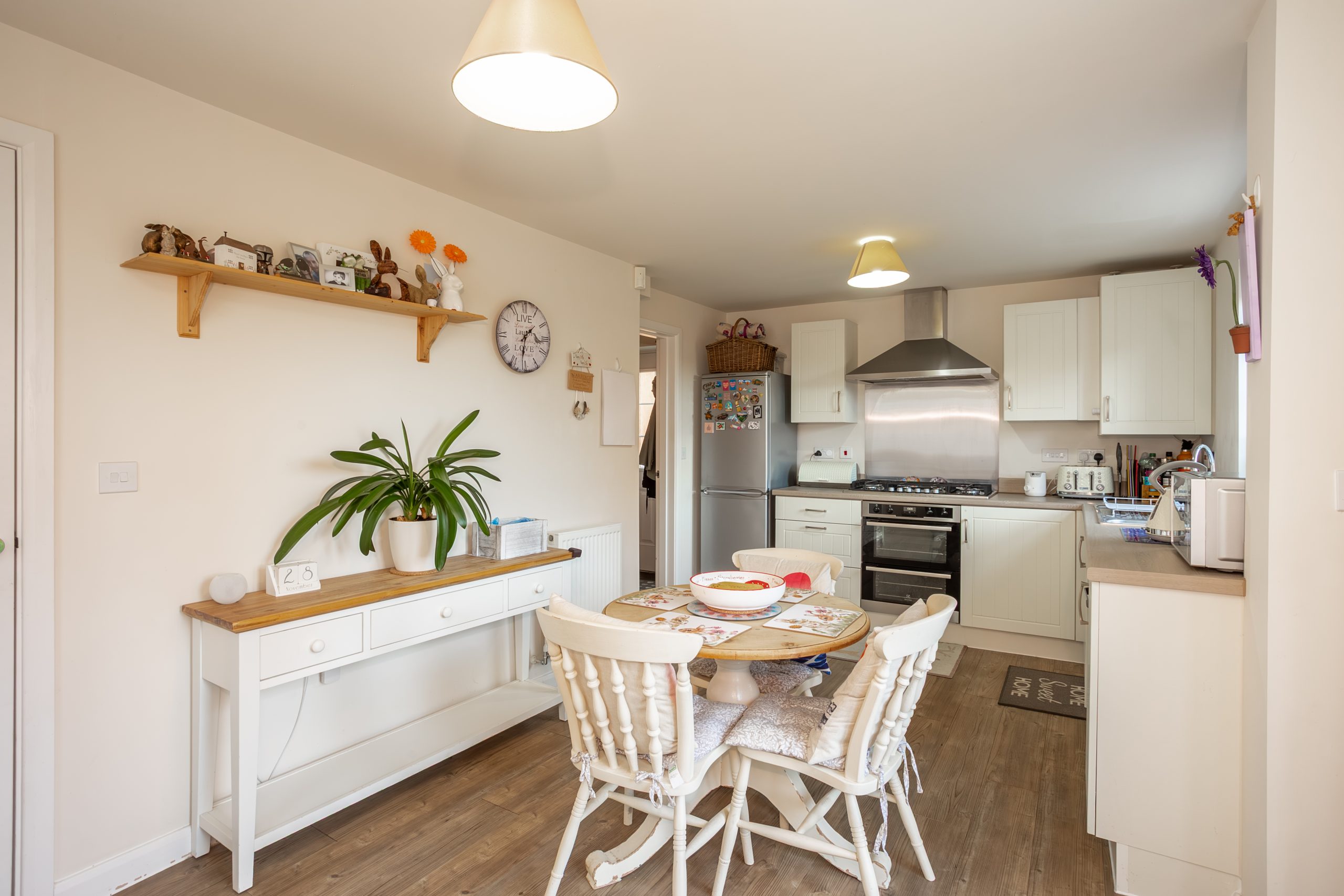 You’re welcomed into a generous entrance hallway, offering access to the spacious dining kitchen, full-length lounge, a convenient downstairs W.C., and the staircase to the first floor. The dining kitchen is a standout feature, with practical wooden flooring and a stylish range of contemporary base and wall units. It includes a built-in oven, hob, and extractor fan, with space for additional appliances. Patio doors open directly onto the rear garden, creating a bright and inviting space with lovely views, perfect for family meals or entertaining. A window further enhances the natural light, while a handy utility room provides extra storage, appliance space, and a second garden access point. The full-length lounge is neutrally decorated and benefits from dual-aspect windows, ensuring a light and airy feel throughout. Completing the ground floor is a modern downstairs W.C., fitted with a white low-level toilet and wash hand basin.