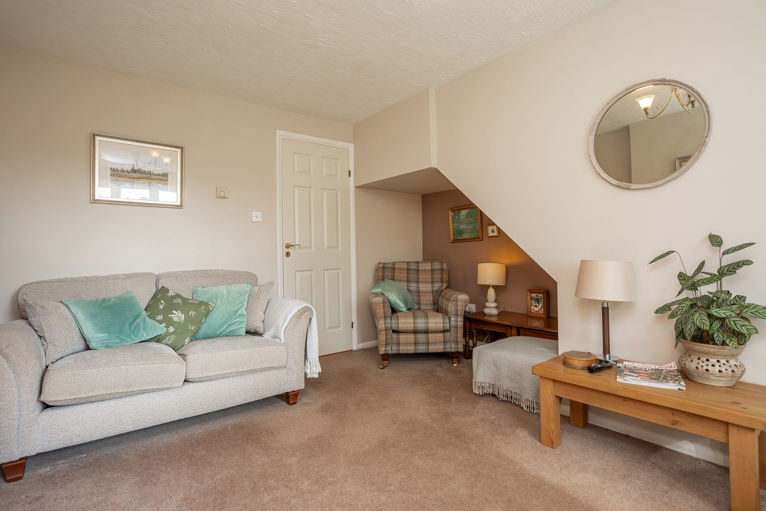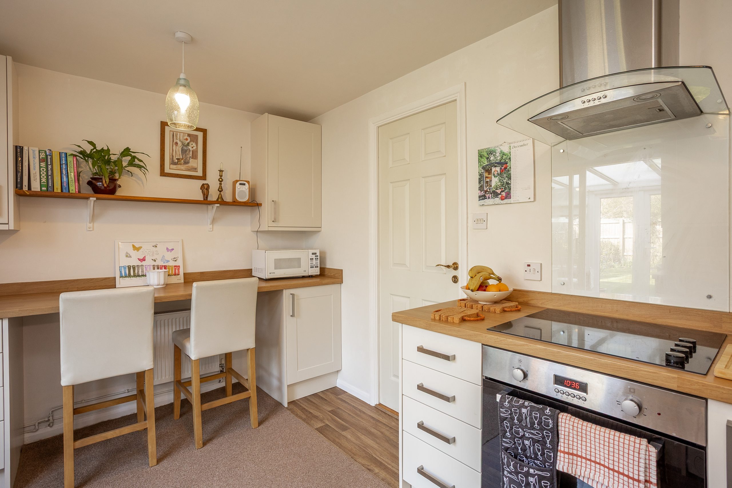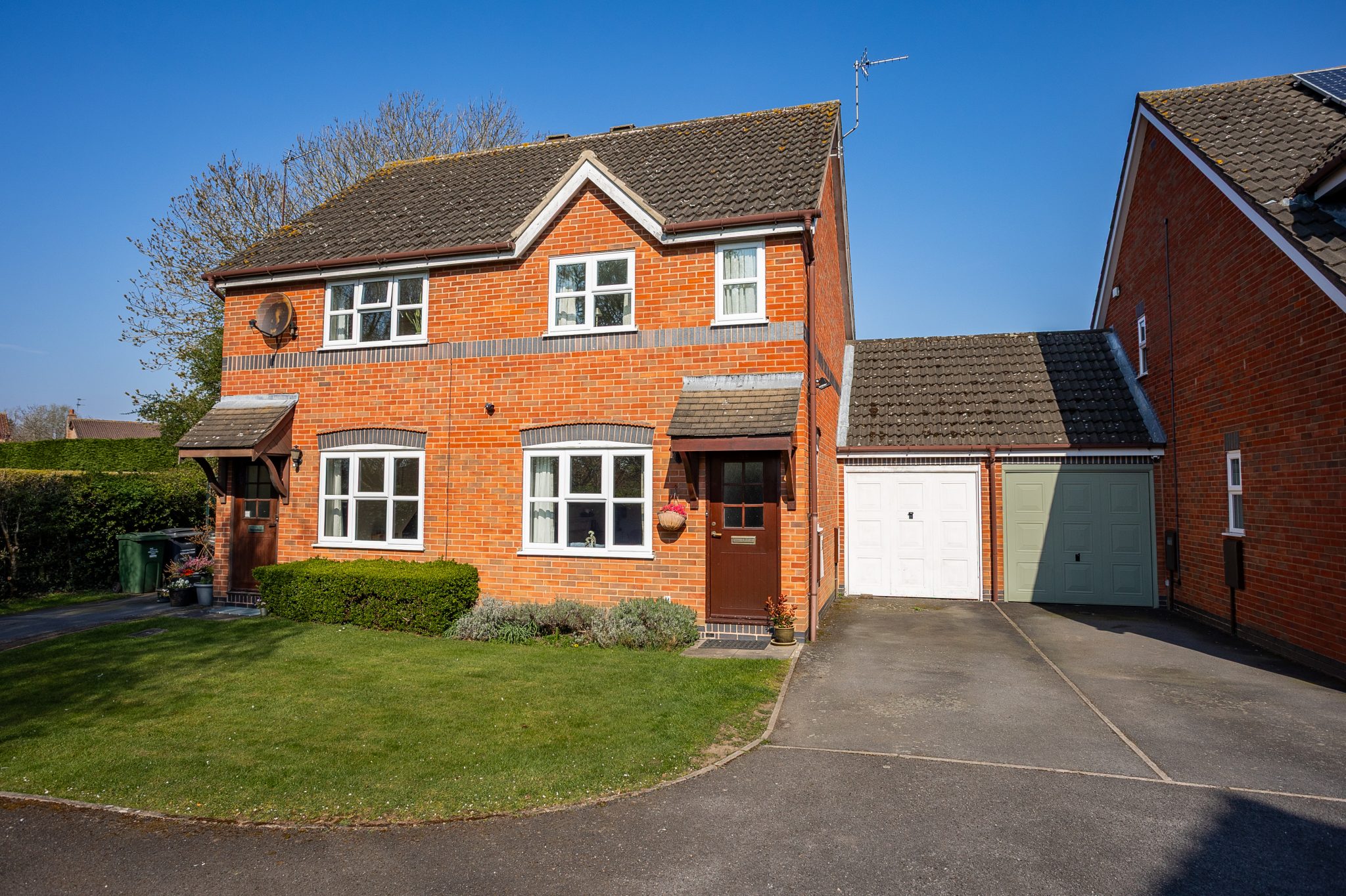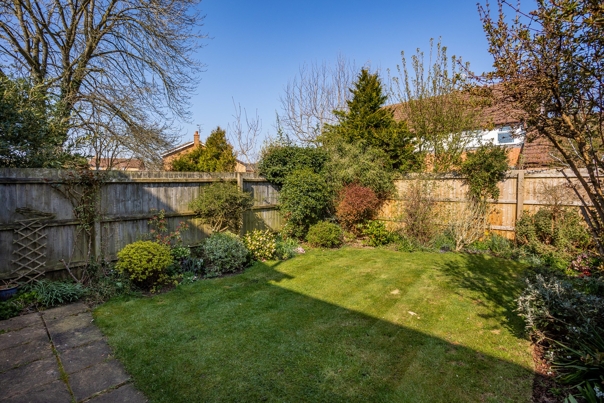 The driveway is located alongside the property, offering off-road parking for two vehicles. The garden is predominantly laid to lawn, providing an ideal space to unwind in the sun.