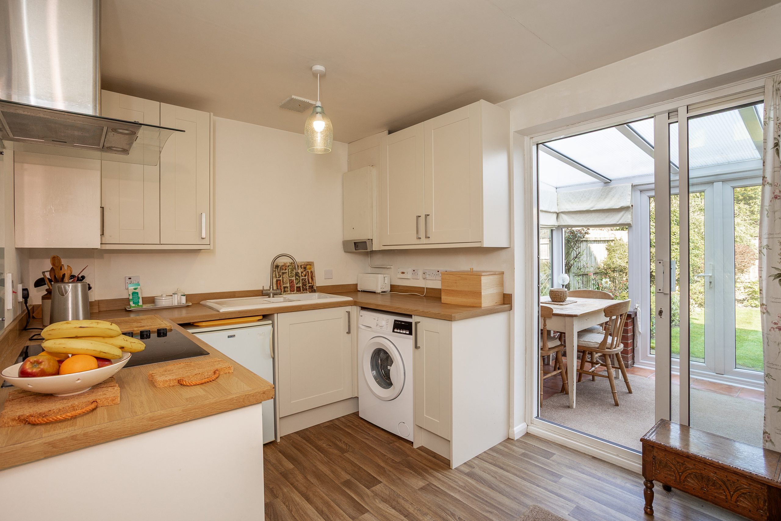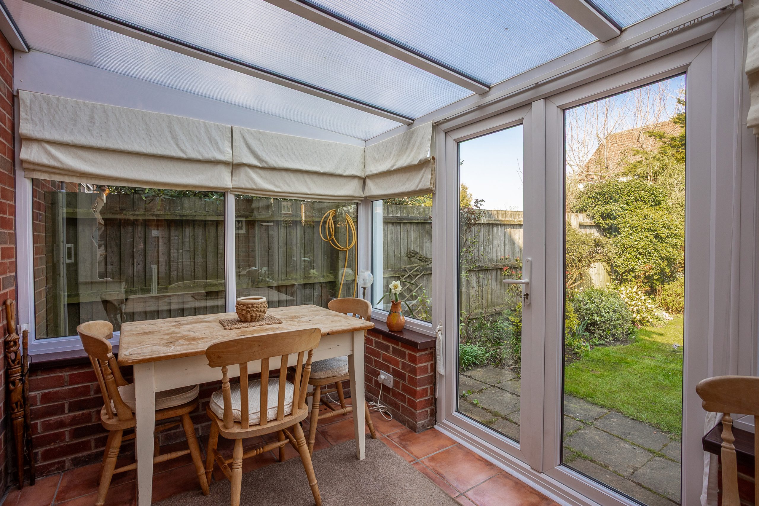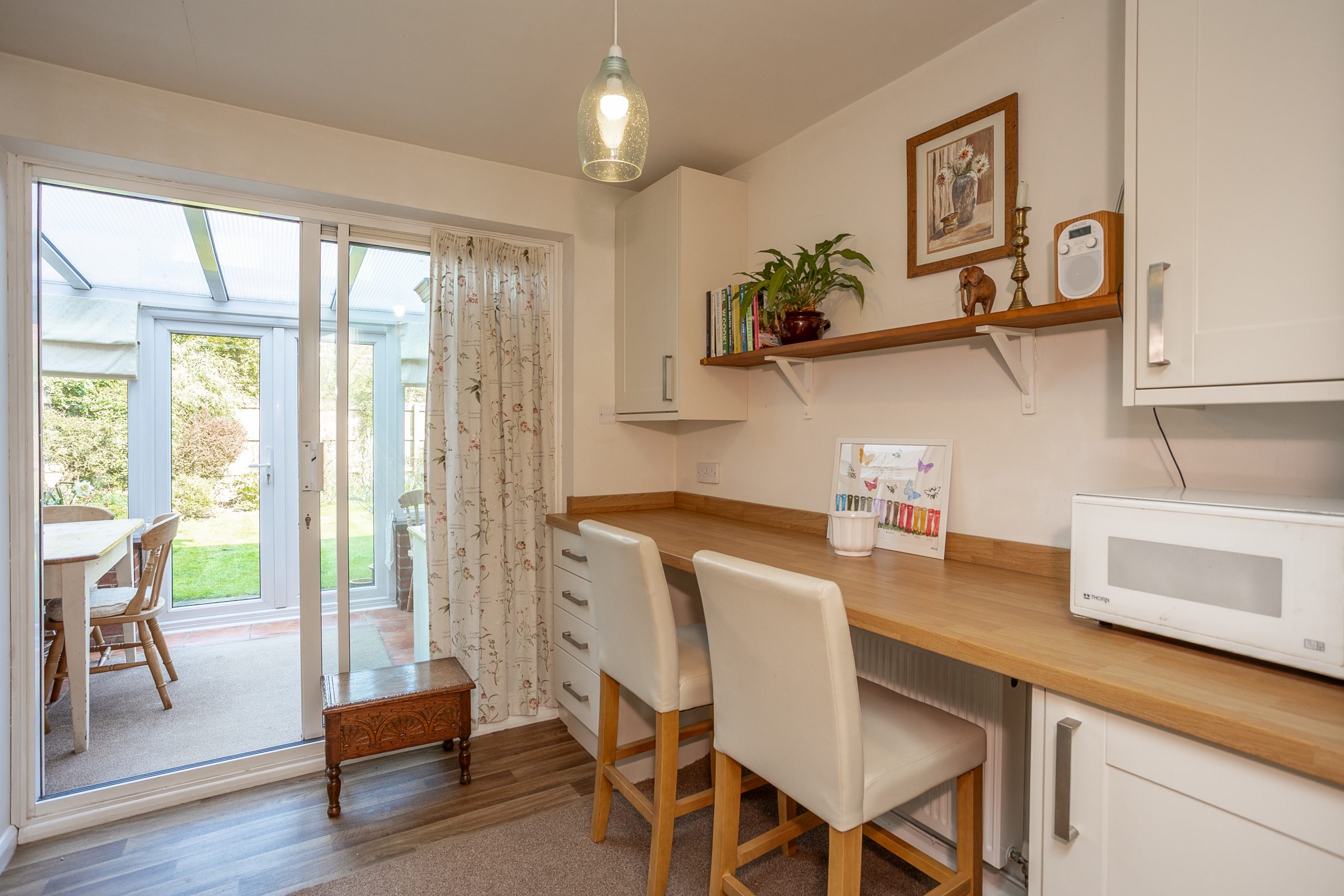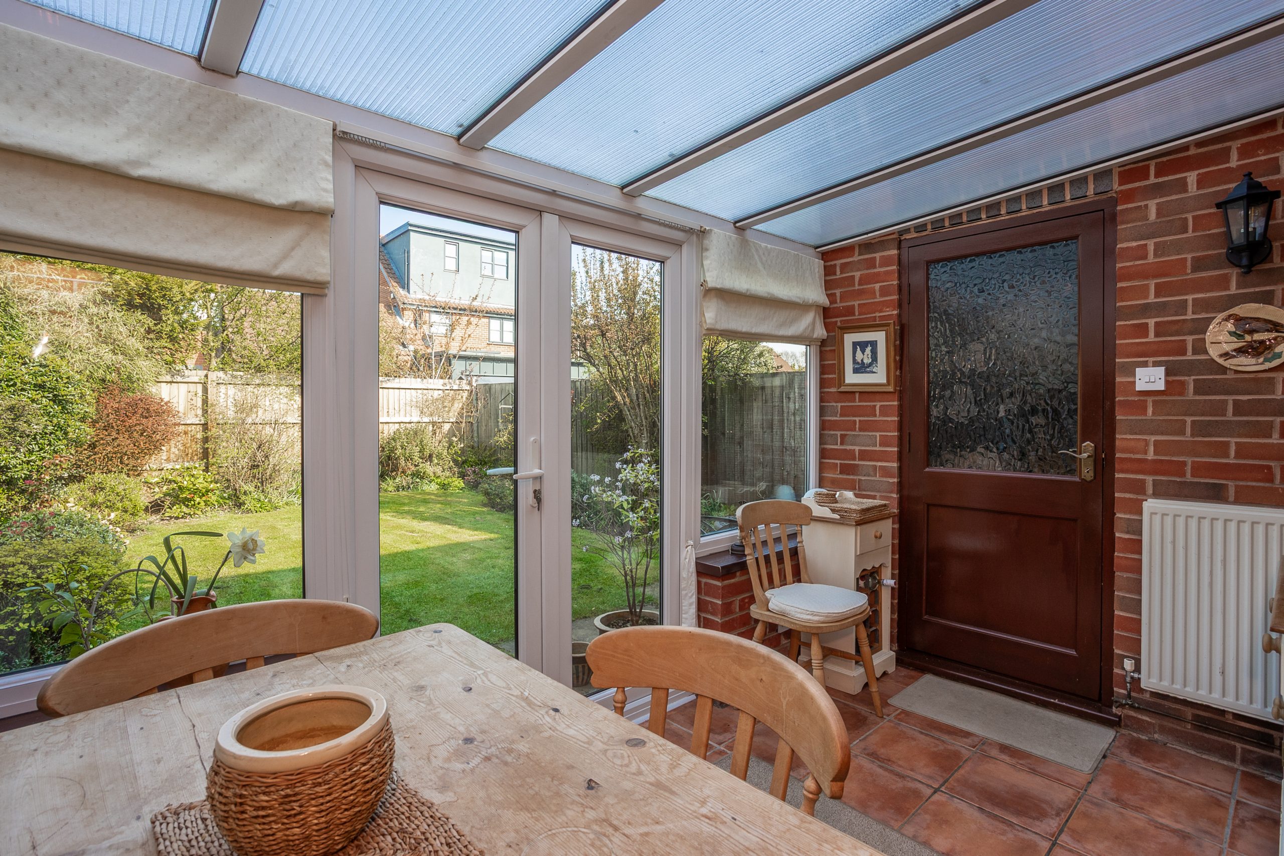 From the kitchen, a sliding door leads into the conservatory, which offers views of the rear garden and ample space for a dining table. Additionally, a door gives access to the single garage, and French doors open out to the garden.