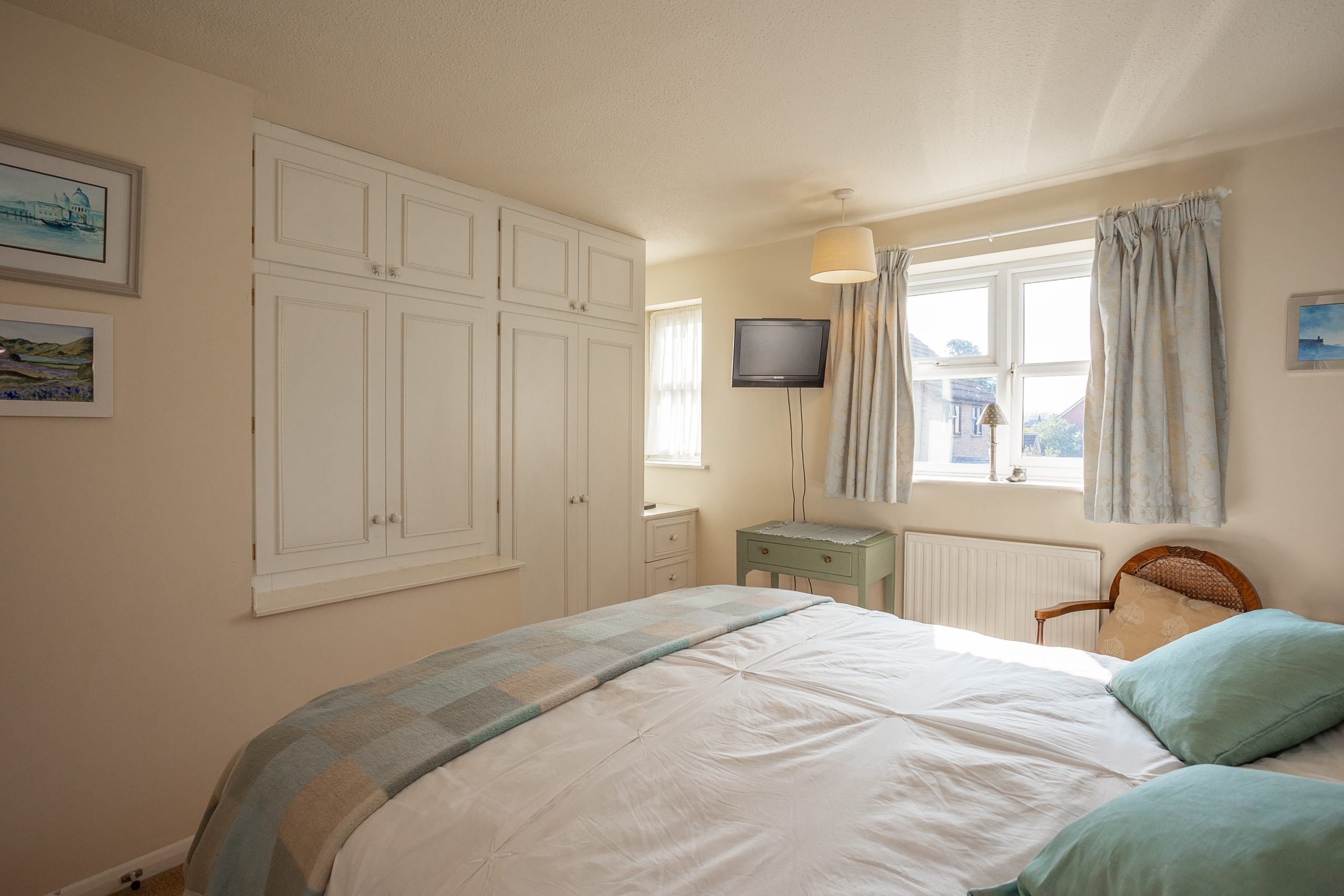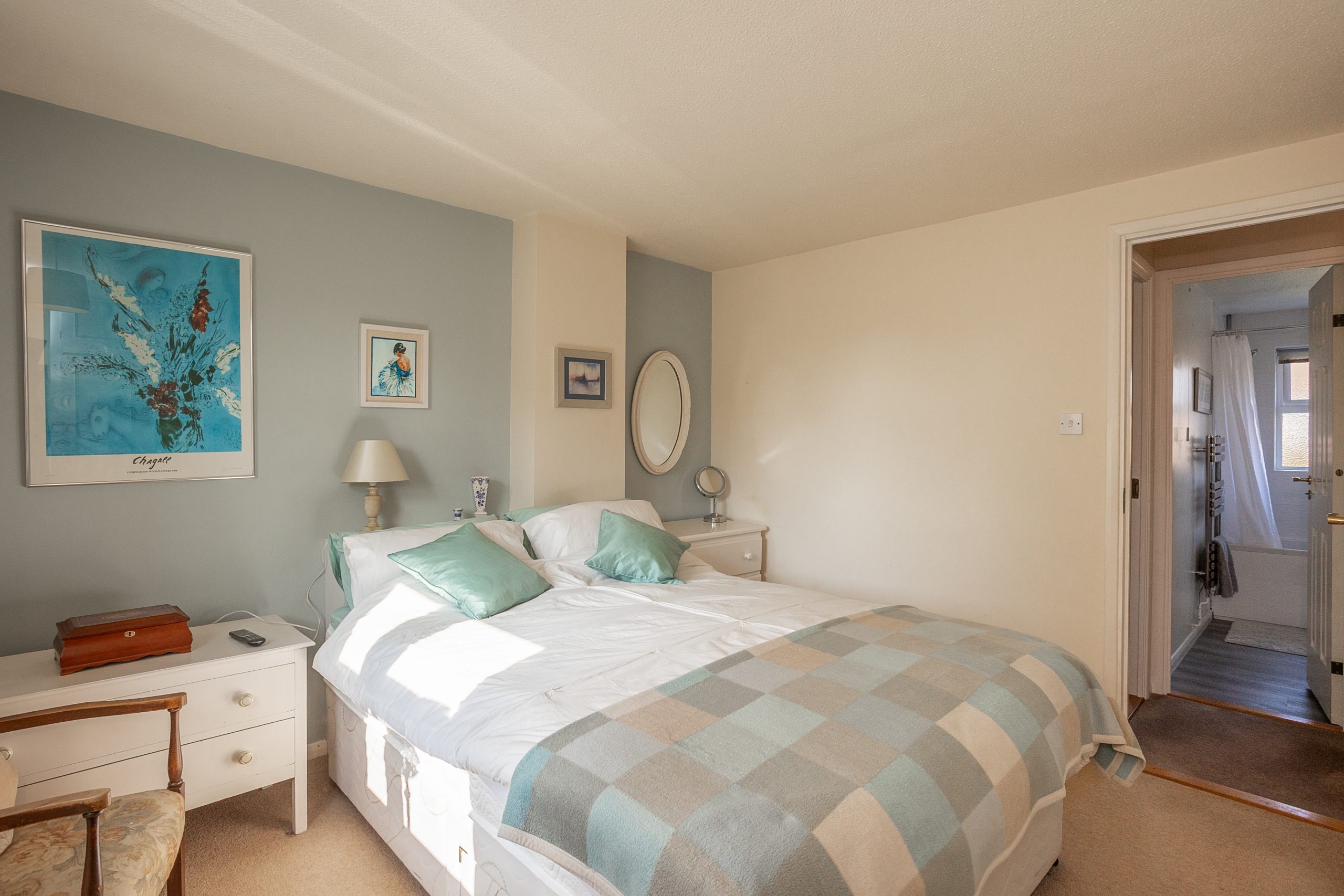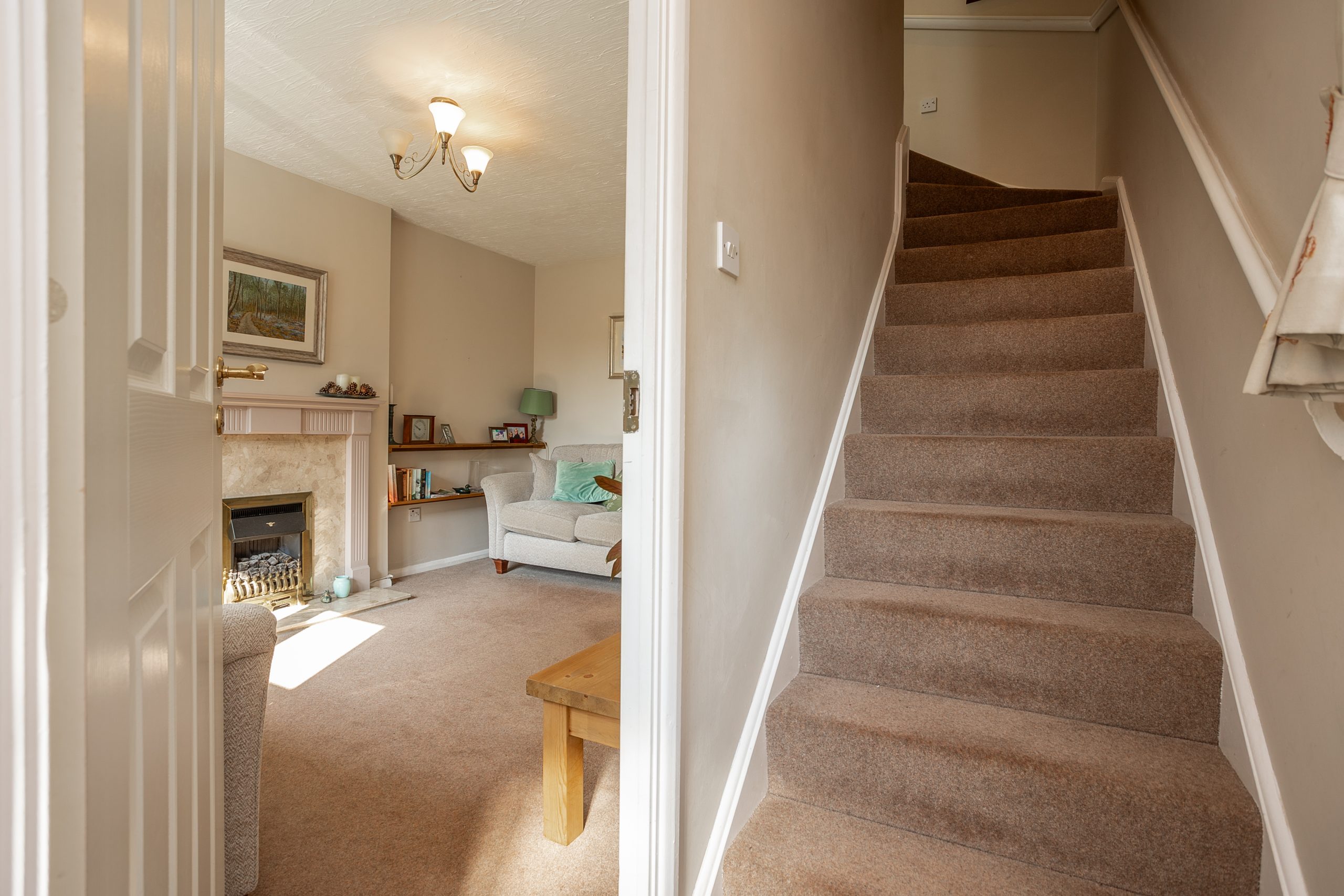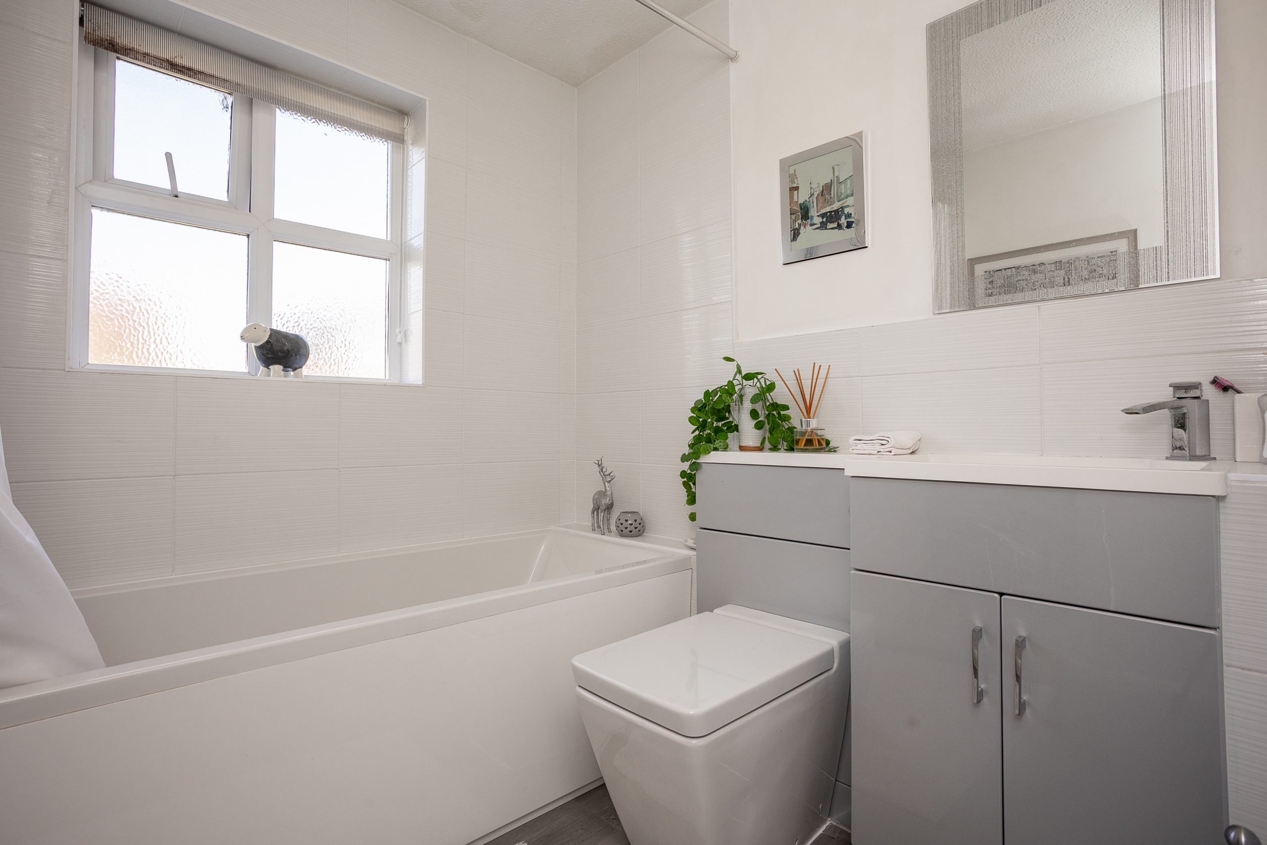 A staircase ascends from the hallway to the landing, where you will find two double bedrooms and a family bathroom. The master bedroom, located at the front of the property, features fitted wardrobes for added convenience. The second bedroom is positioned at the rear of the home. The bathroom has been stylishly updated with a modern three-piece suite and a light grey vanity.