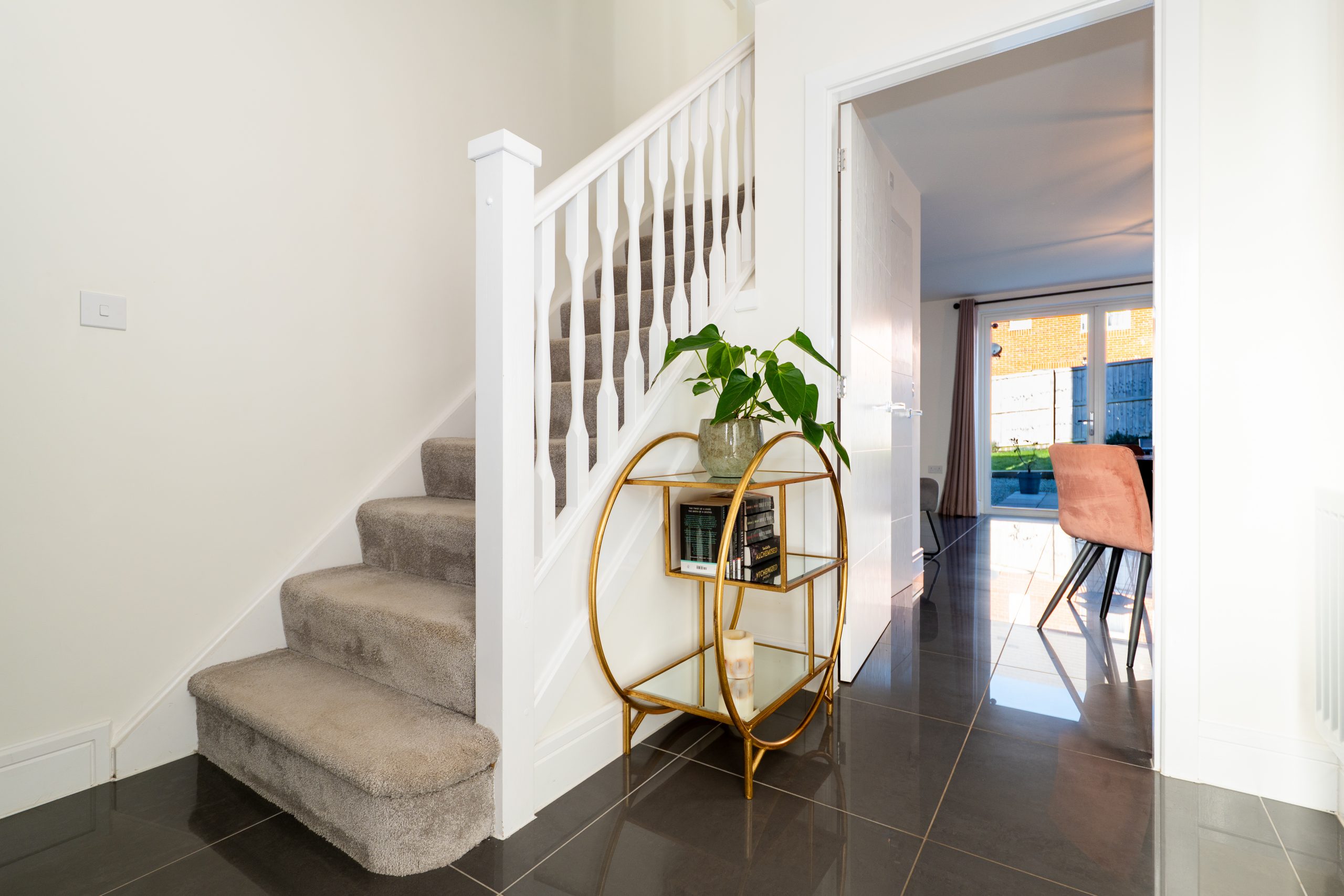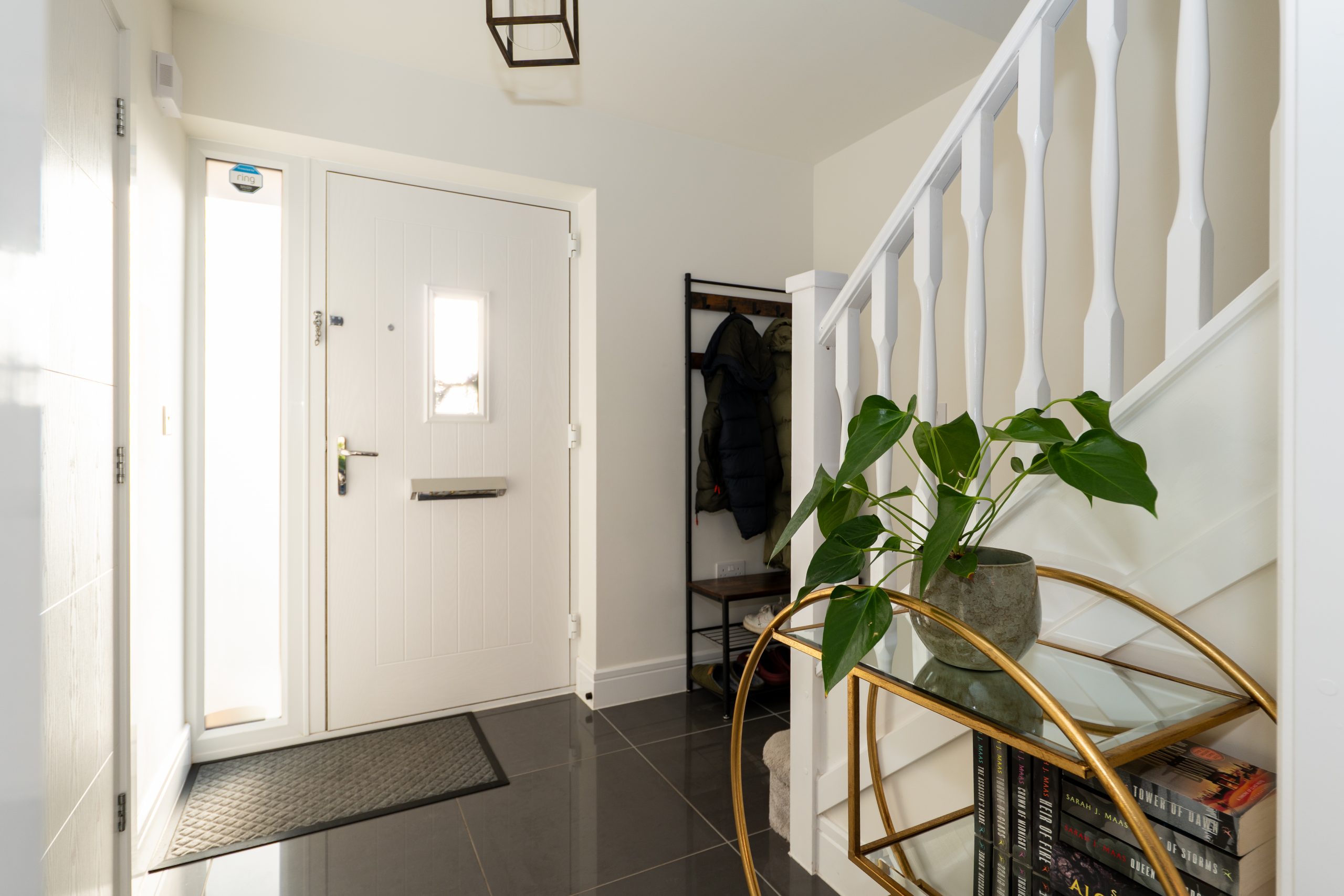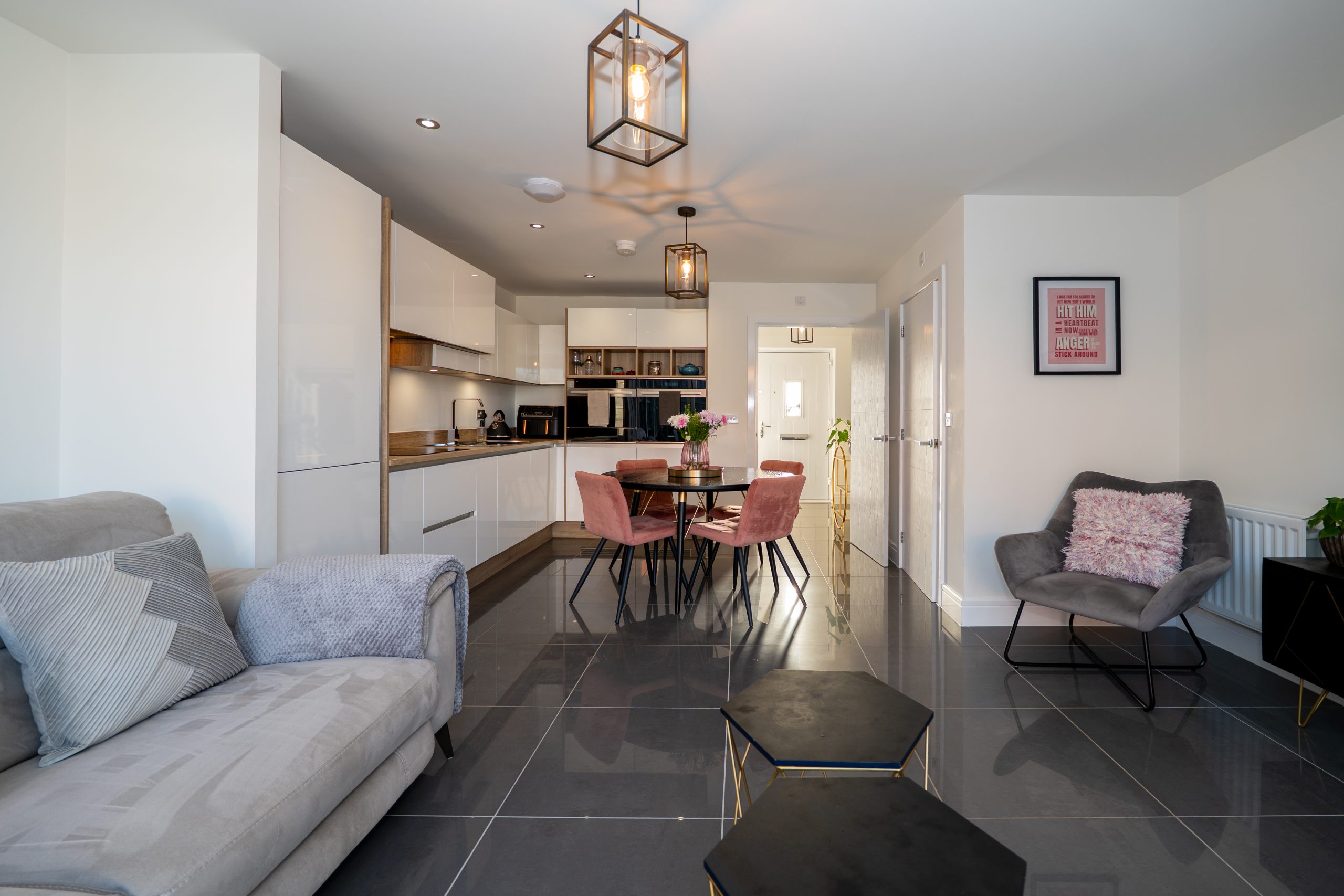 The property is entered via a welcoming hallway with access to the staircase and a generous downstairs WC. The hallway leads into an impressive open-plan living space finished with large dark grey tiled flooring and a combination of spotlights and main lighting.