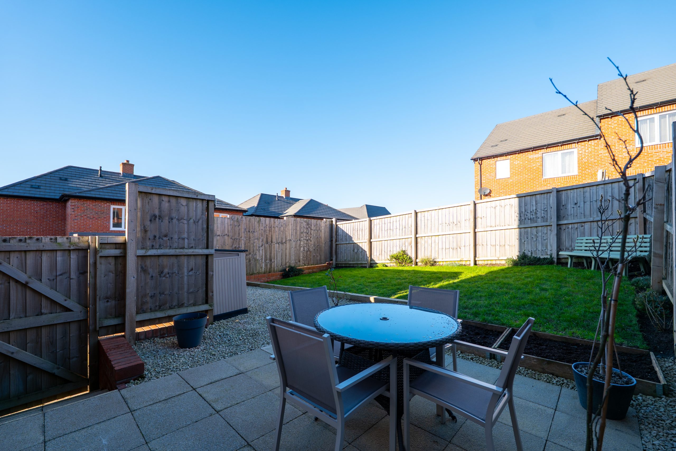 The property benefits from a tandem driveway to the side, providing off-road parking for two vehicles. A gated side access leads to the enclosed rear garden, which is accessed directly from the main living area via bi-fold doors. The garden features a patio seating area, stone detailing, and a lawned section, creating an attractive and practical outdoor space. External power sockets are located within the garden, ideal for outdoor use and entertaining.