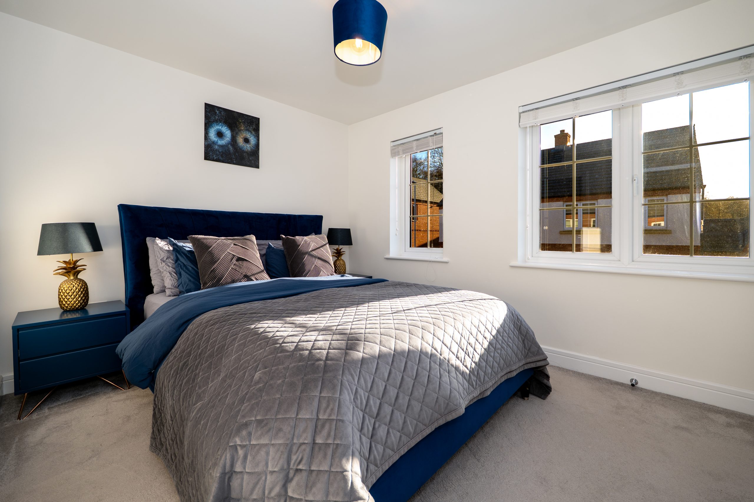 The main bedroom is located at the front of the property and benefits from fitted wardrobe space and two front-facing windows. The en-suite features a bath with shower over, floating vanity unit, silver fittings, and floor-to-ceiling light grey tiling.