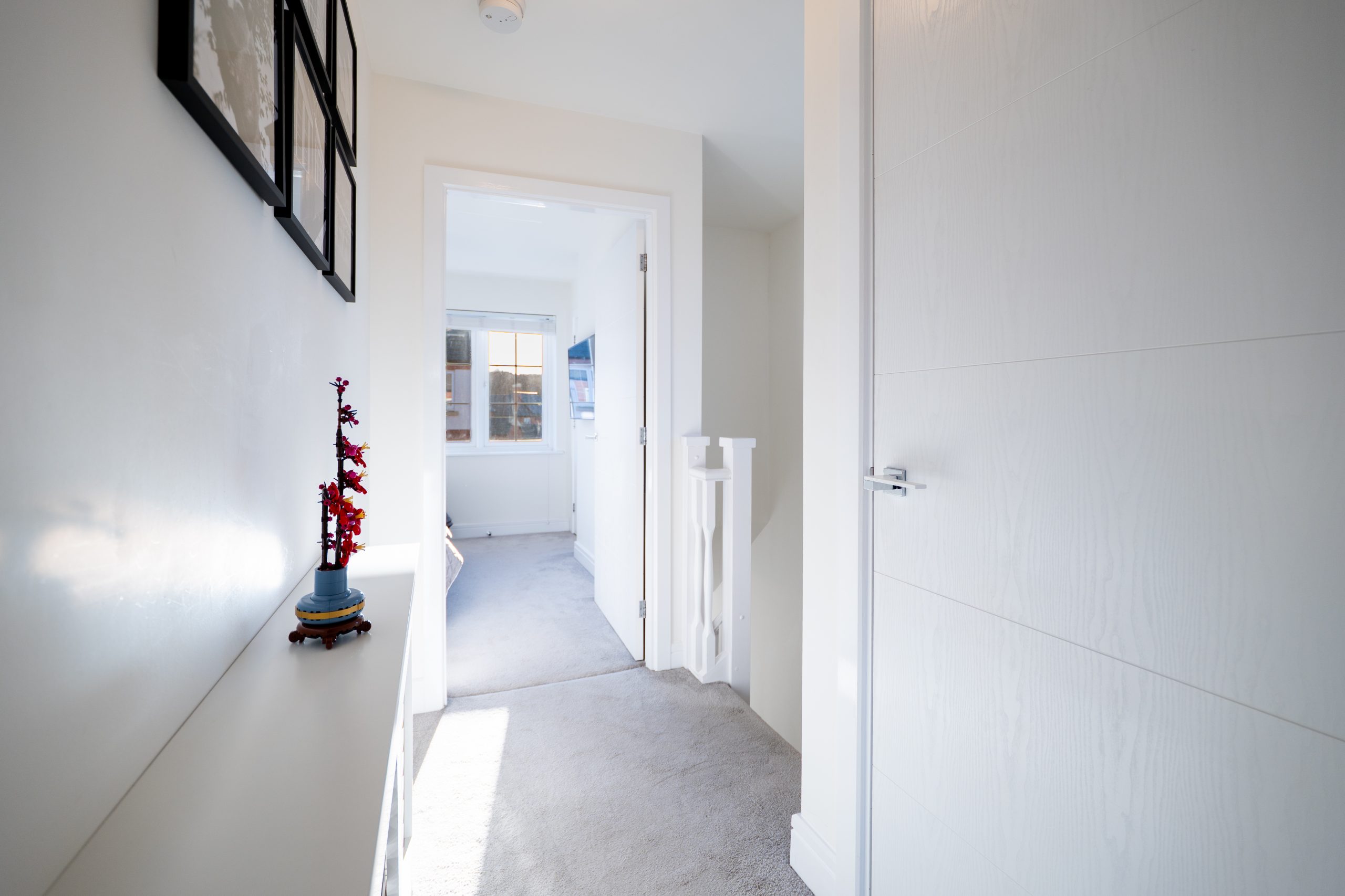 The first floor, finished with grey carpeting, provides access to two well-proportioned double bedrooms.