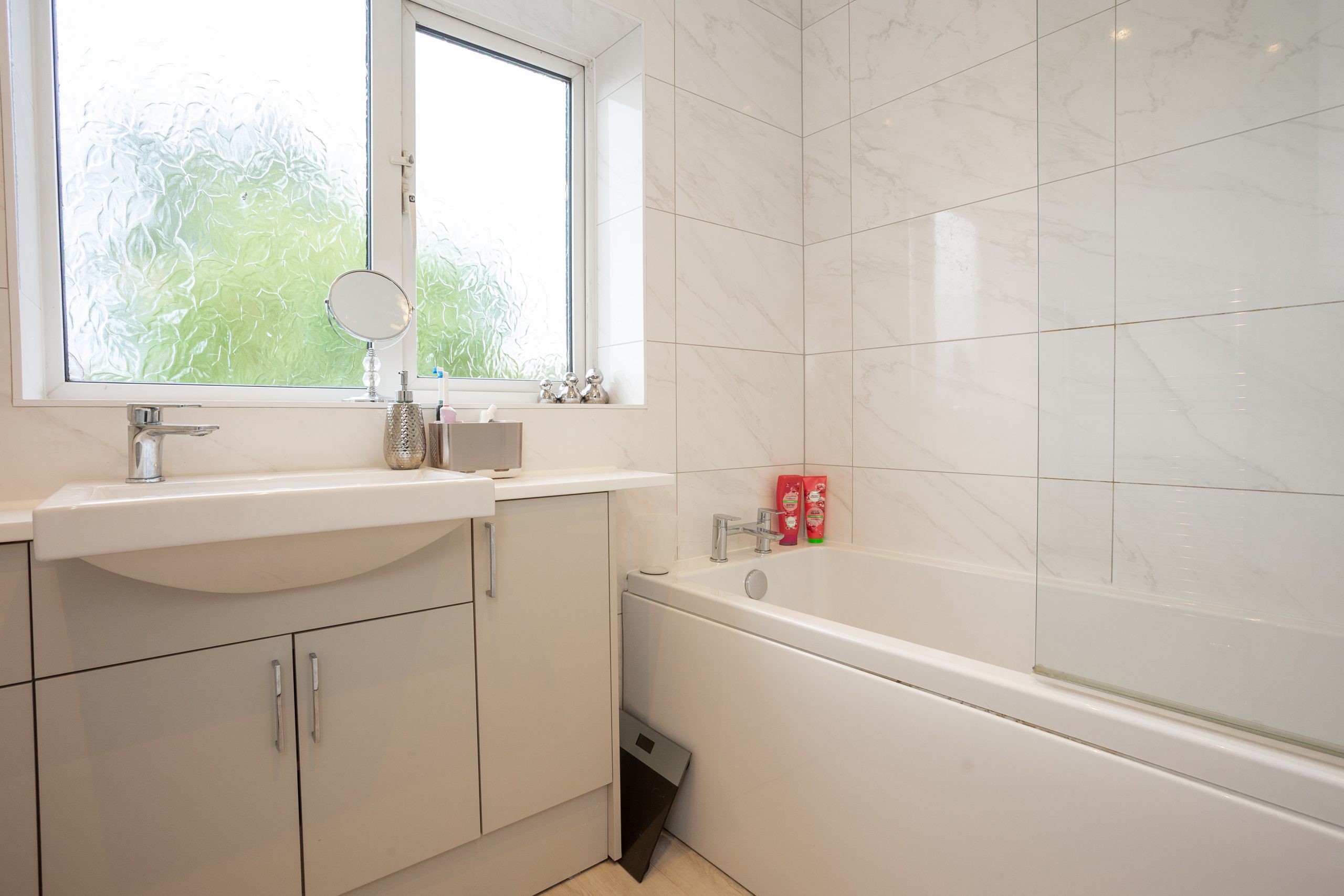 - Newly fitted bathroom with marble-effect finish and overhead shower