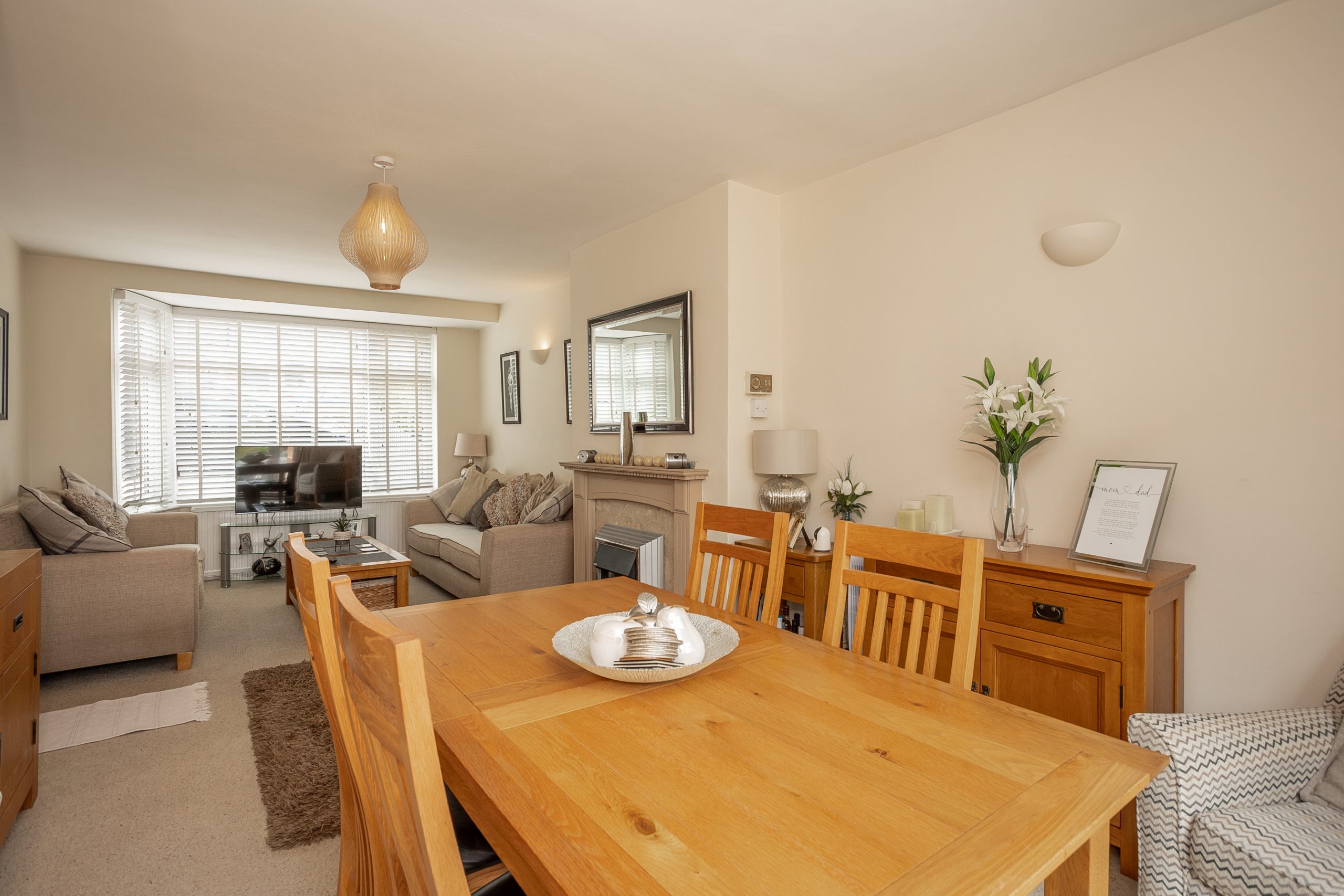 The property features an entrance hallway. The spacious, bright, and airy open-plan lounge and dining area are neutrally decorated, complemented by a modern fireplace, with the dining space opening onto the rear garden.