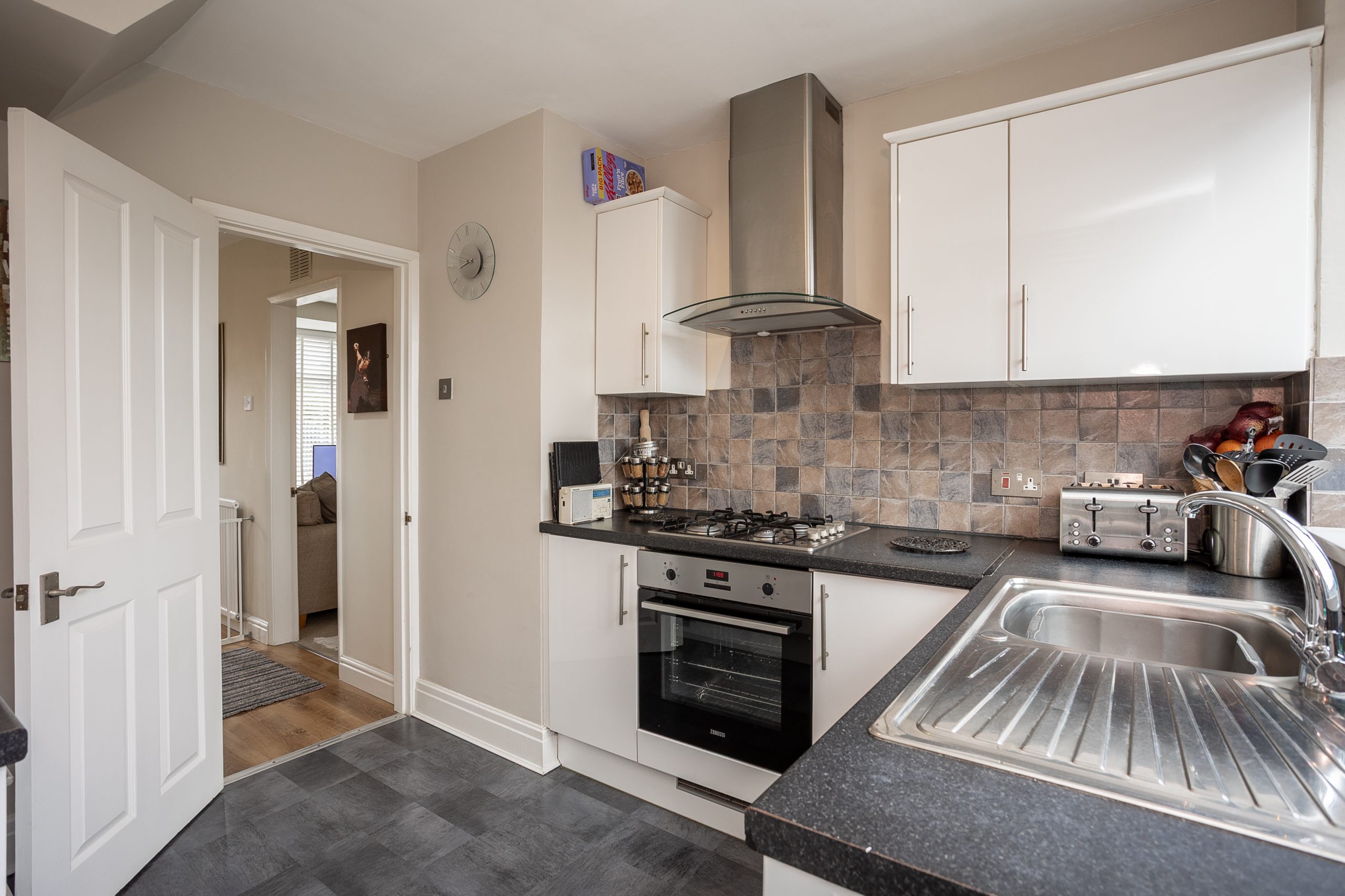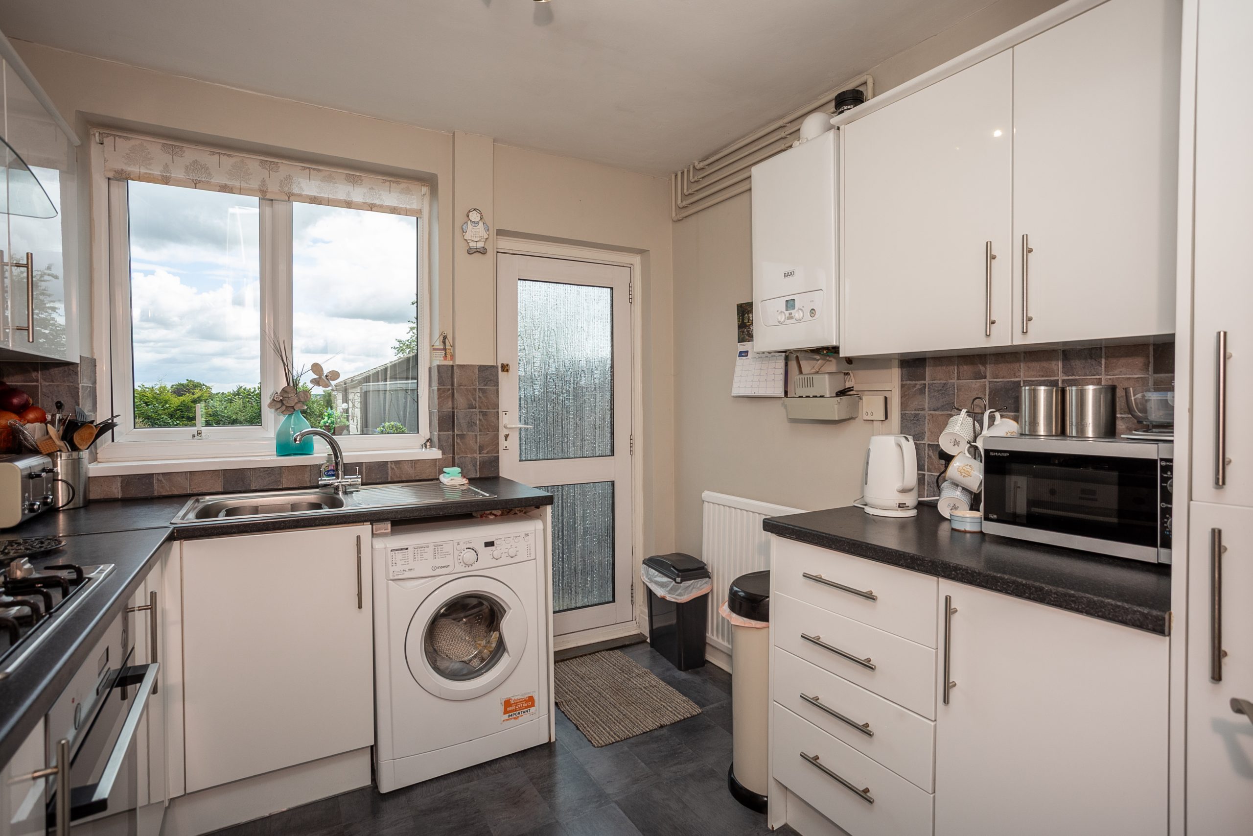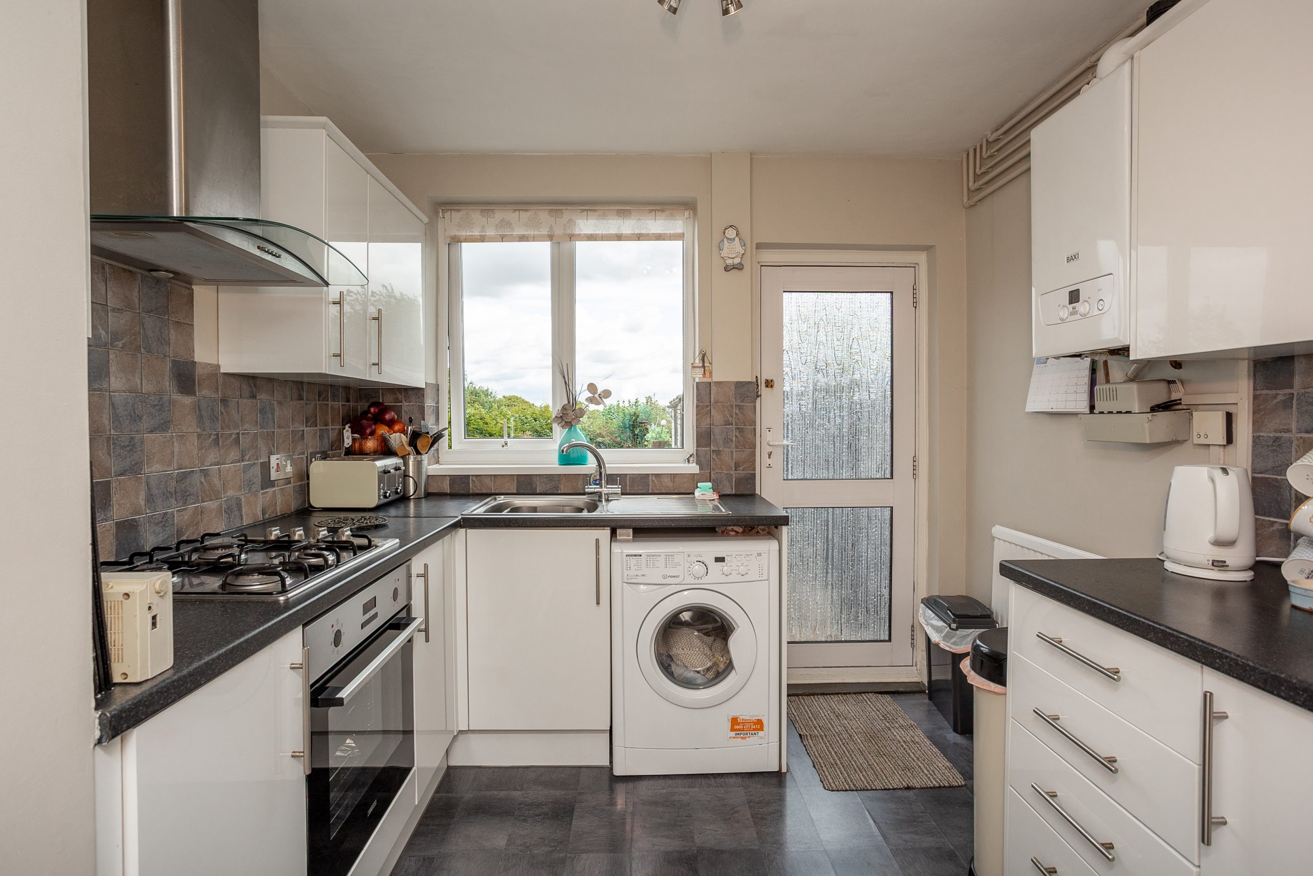 The contemporary kitchen is equipped with white gloss units, matching worktops, and a tiled splashback. It includes a built-in oven, gas hob with extractor fan, integrated fridge/freezer, and space for a washing machine. Additionally, there is a service door leading to the rear garden.