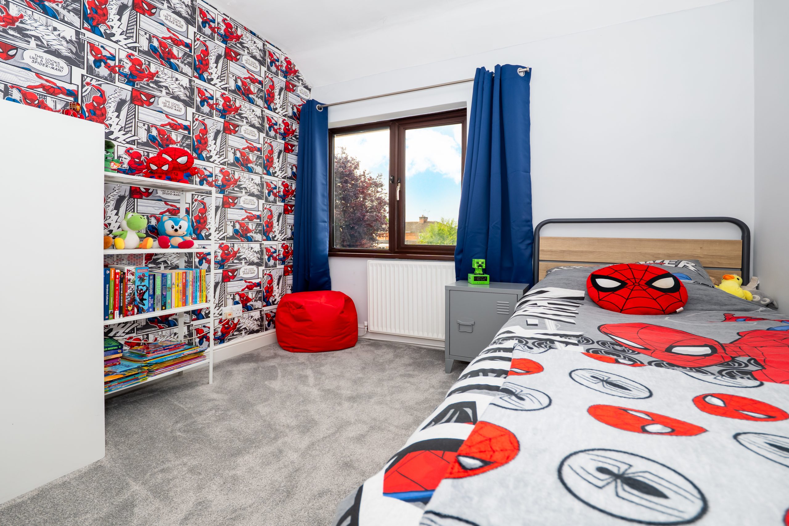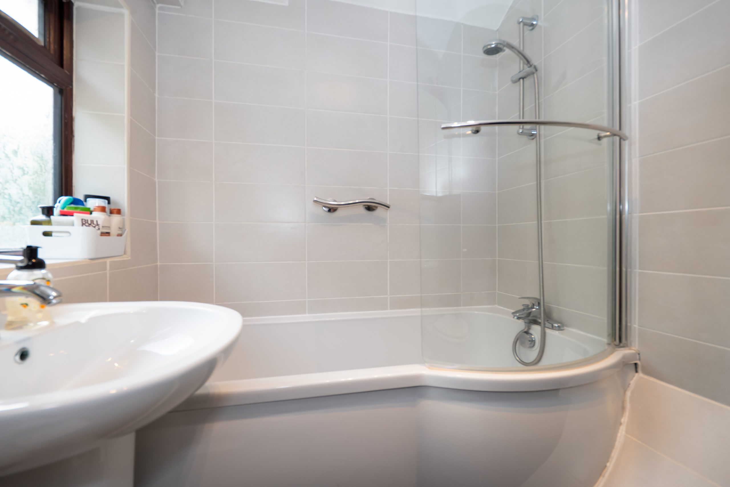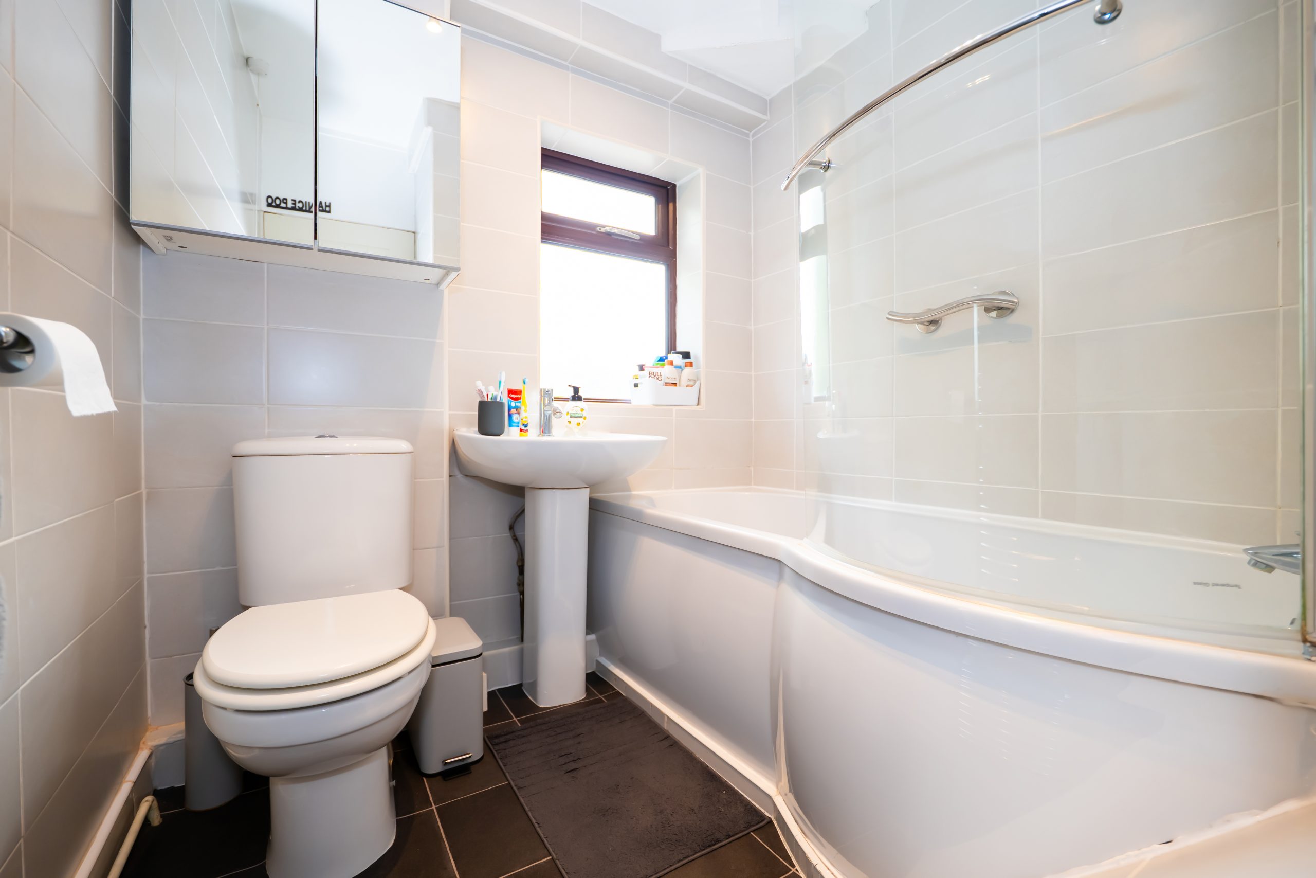 The first-floor landing provides access to three well-proportioned bedrooms and the family bathroom, while also featuring loft access and a window overlooking the side elevation, allowing natural light to brighten the space. The primary bedroom, a double, enjoys a large front-facing bay window that fills the room with natural light and benefits from a range of fitted wardrobes, offering ample storage. The second bedroom, also a double, is situated at the rear of the property and features recently fitted carpeting, adding a fresh and cosy touch. The third bedroom, likewise, positioned at the rear, enjoys peaceful views overlooking the garden, making it an ideal retreat for relaxation and privacy. The recently upgraded family bathroom is stylishly finished with a modern white three-piece suite, comprising a pedestal wash basin, a low-level WC, and a P-shaped bath with an overhead shower. Tiled walls and flooring enhance the contemporary aesthetic, while a curved glass shower screen adds a sleek, modern touch. A chrome heated towel rail completes the space, ensuring both comfort and practicality.