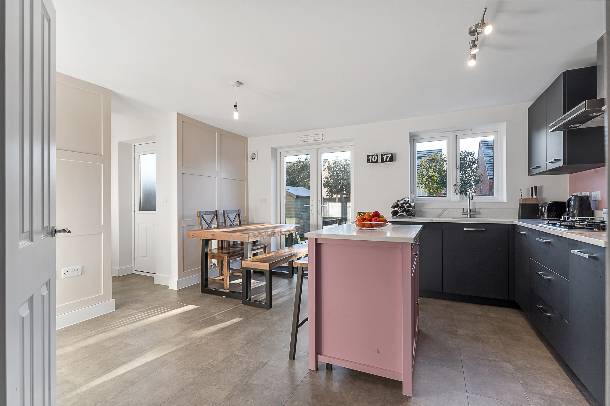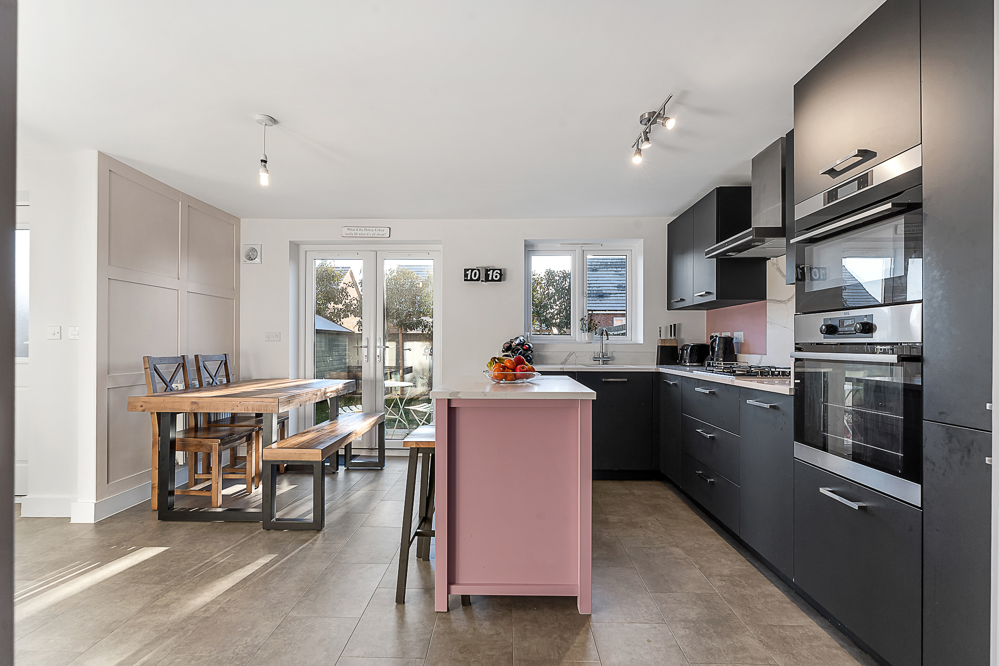 Positioned at the rear of the property, the spacious dining kitchen is equipped with a comprehensive range of eye level and base units, generous work surfaces, central island and integrated appliances including a fridge/freezer, dishwasher, AEG oven and microwave, gas hob, and extractor and decorated with tiled flooring and feature panelling on one wall. A rear-facing window overlooks the garden, while adjacent double patio doors open directly outside, making indoor–outdoor dining effortless.