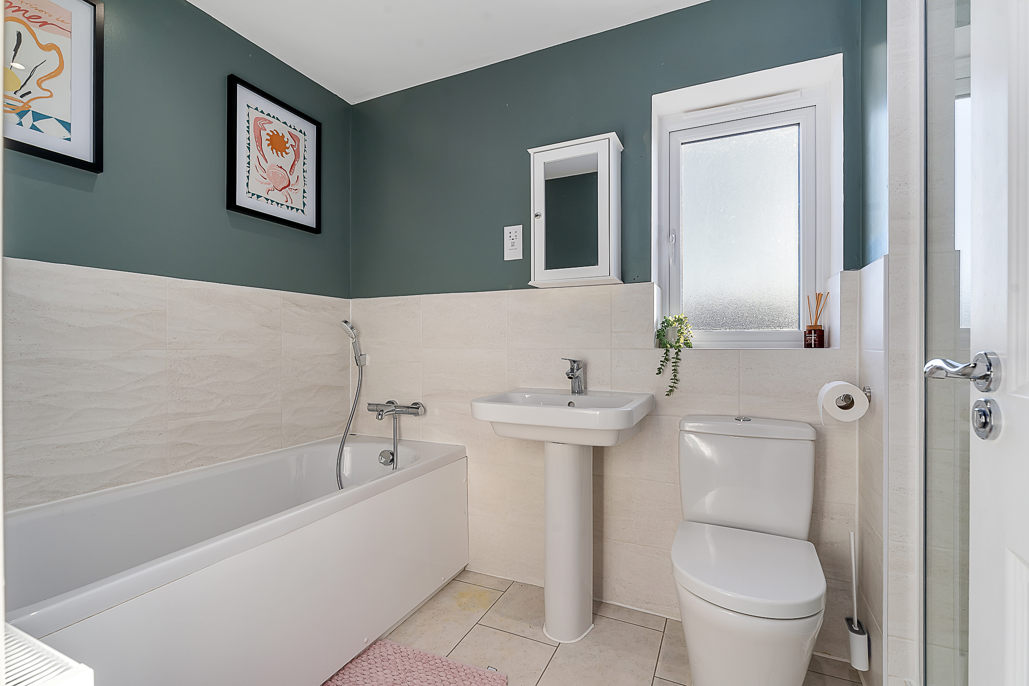 Bedrooms Two and Three are positioned at the rear of the property and are both well proportioned doubles, further emphasising the home’s suitability for family living. These rooms are served by the family bathroom, which features a four piece suite including a separate shower cubicle, panelled bath, low level WC, pedestal wash basin, tiled flooring and a heated towel rail.