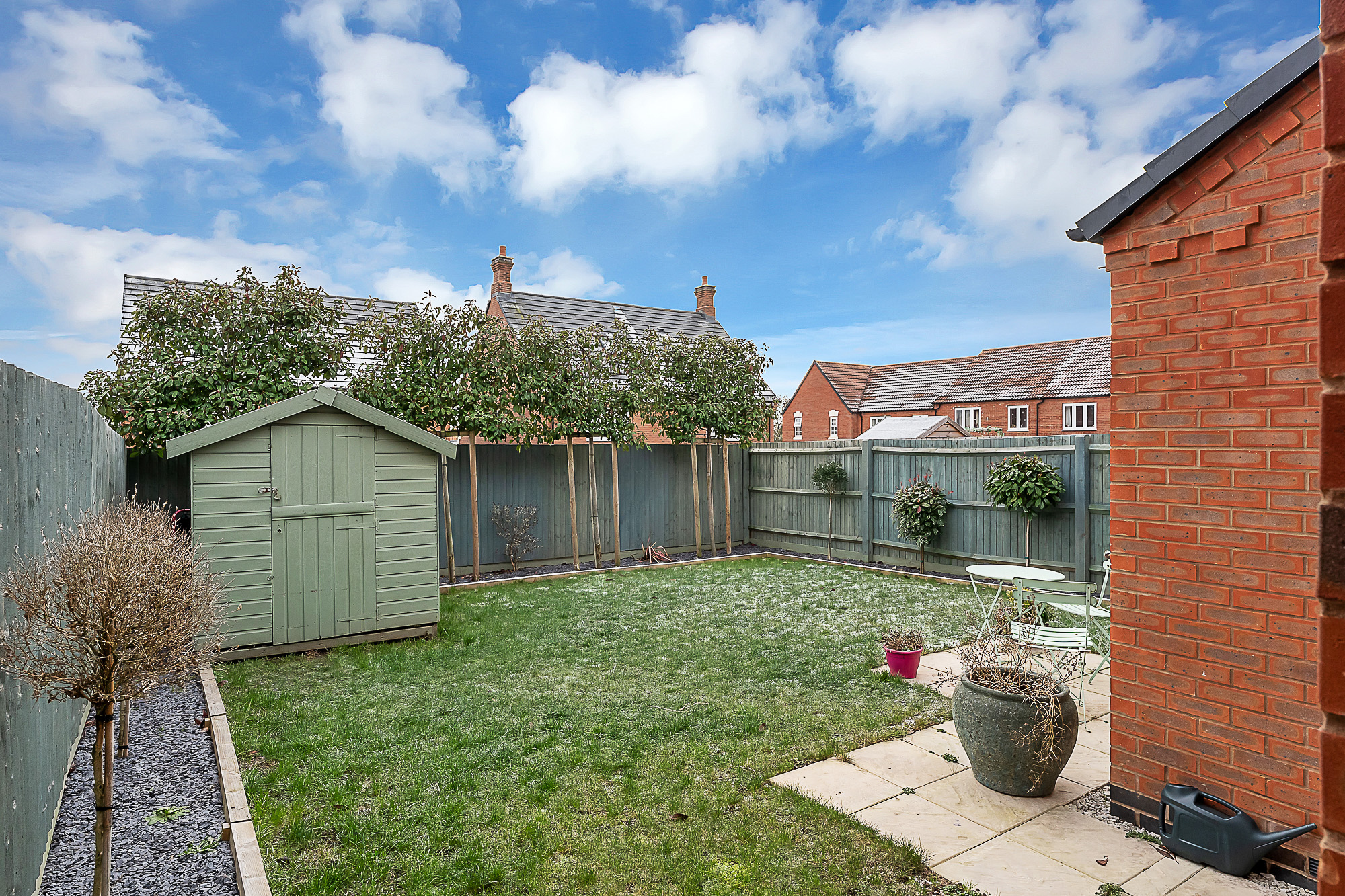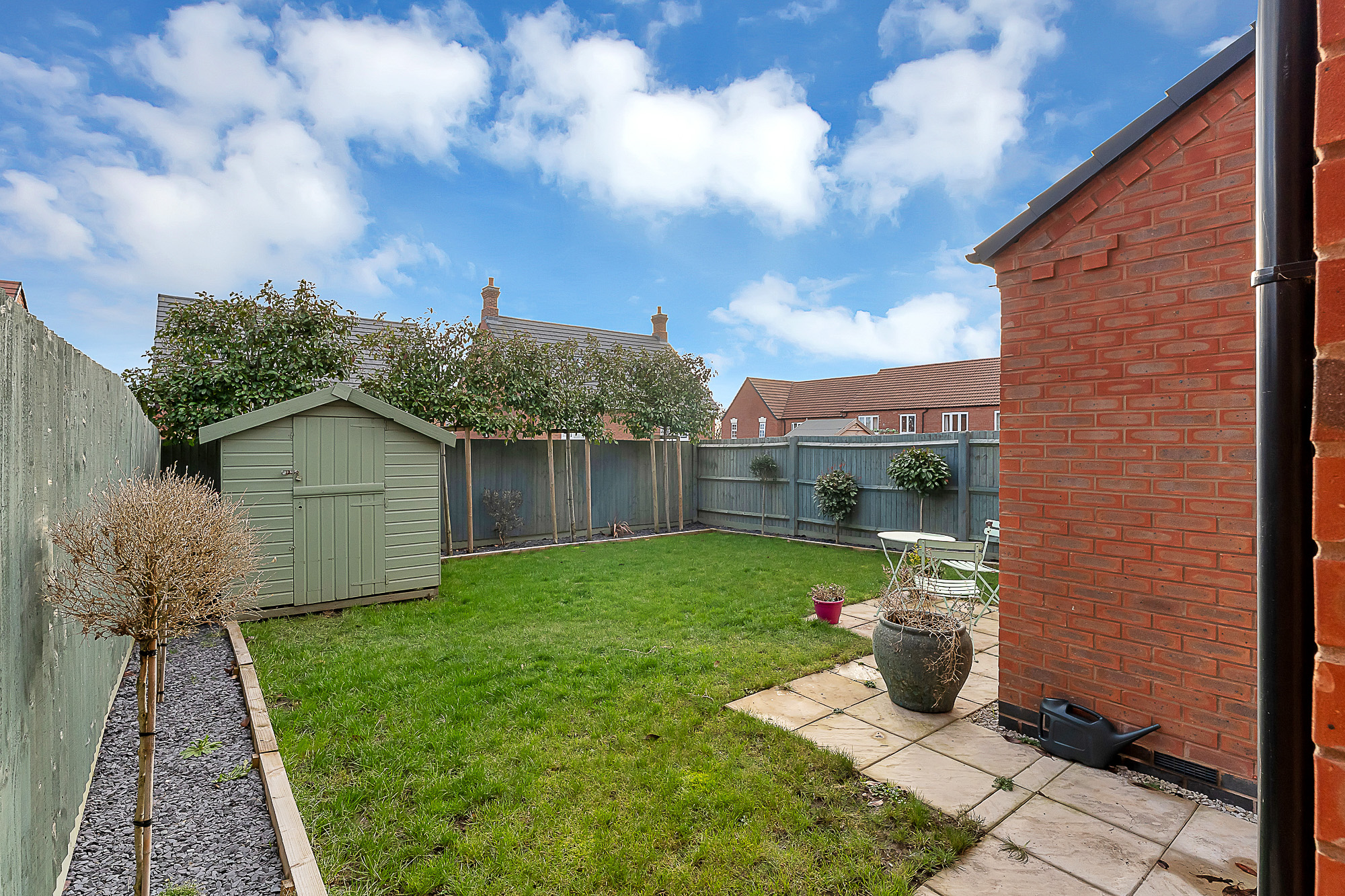 The rear garden is predominantly laid to lawn and enjoys a desirable south easterly aspect. A well positioned patio offers the perfect spot for outdoor dining or relaxation, while thoughtfully placed trees and shrubs add interest and privacy. A garden shed provides useful storage for tools, equipment, or children’s outdoor toys.