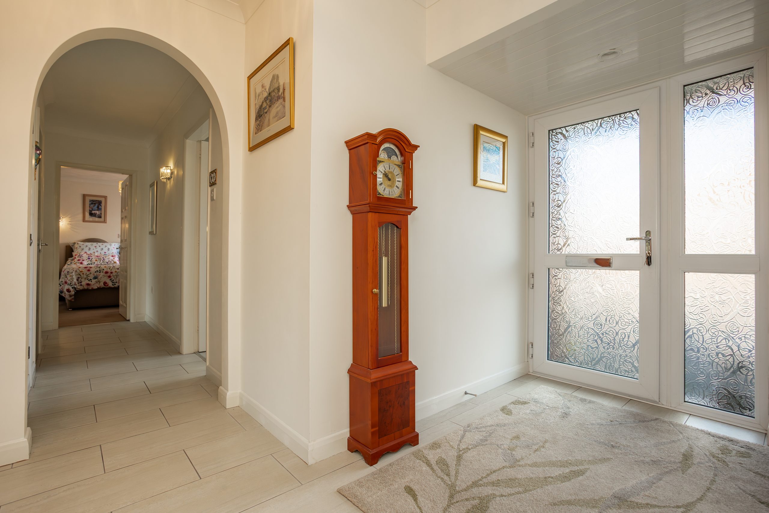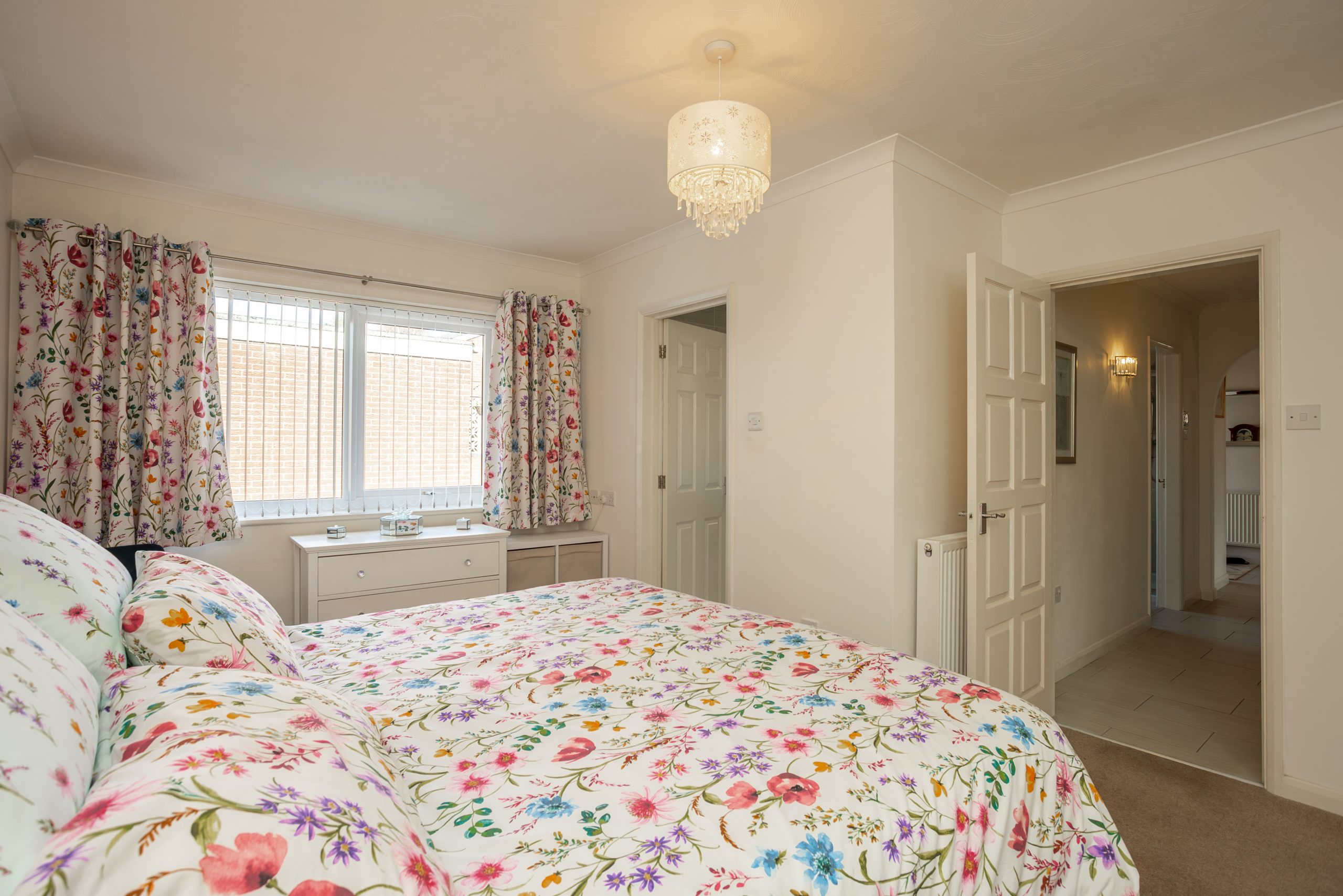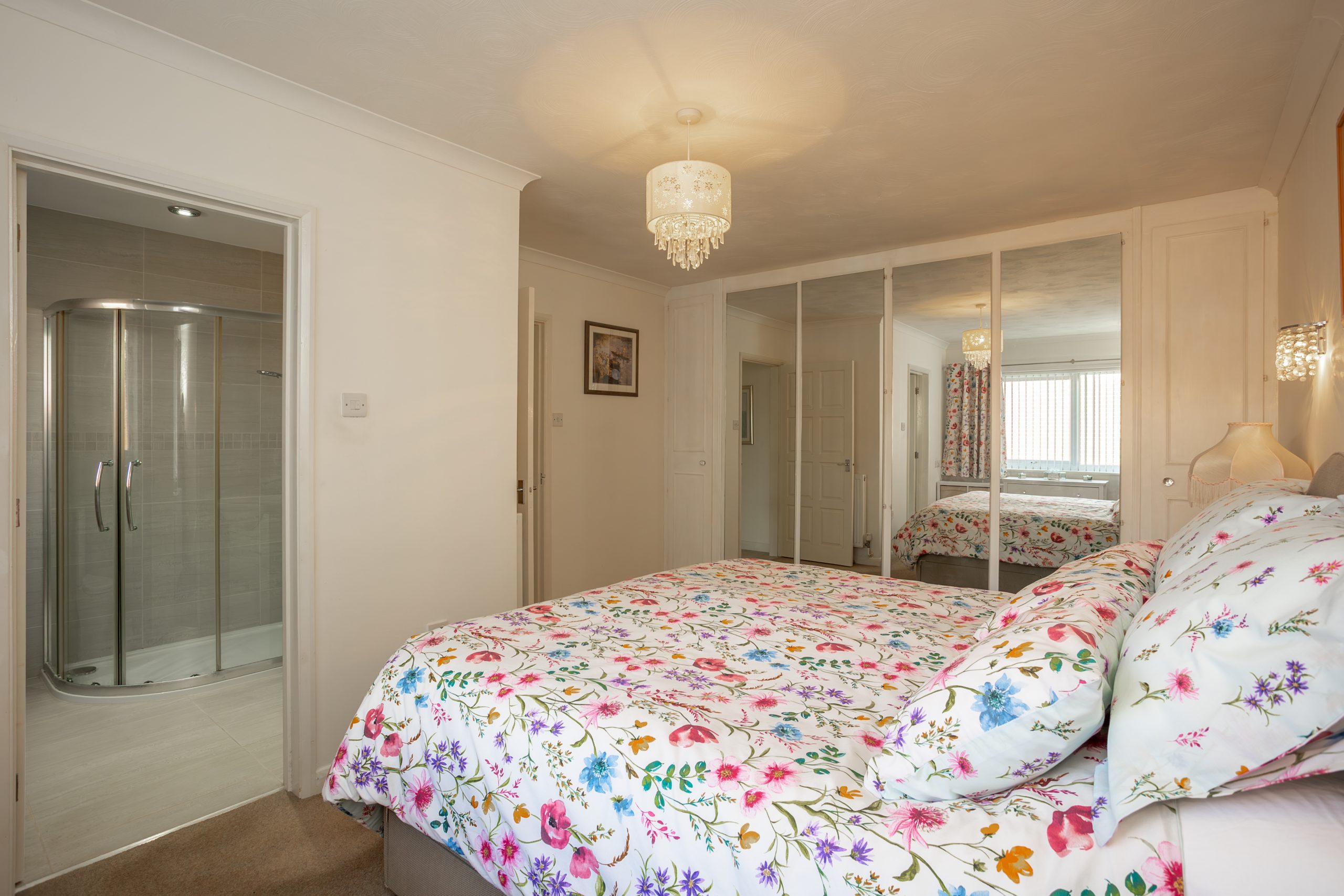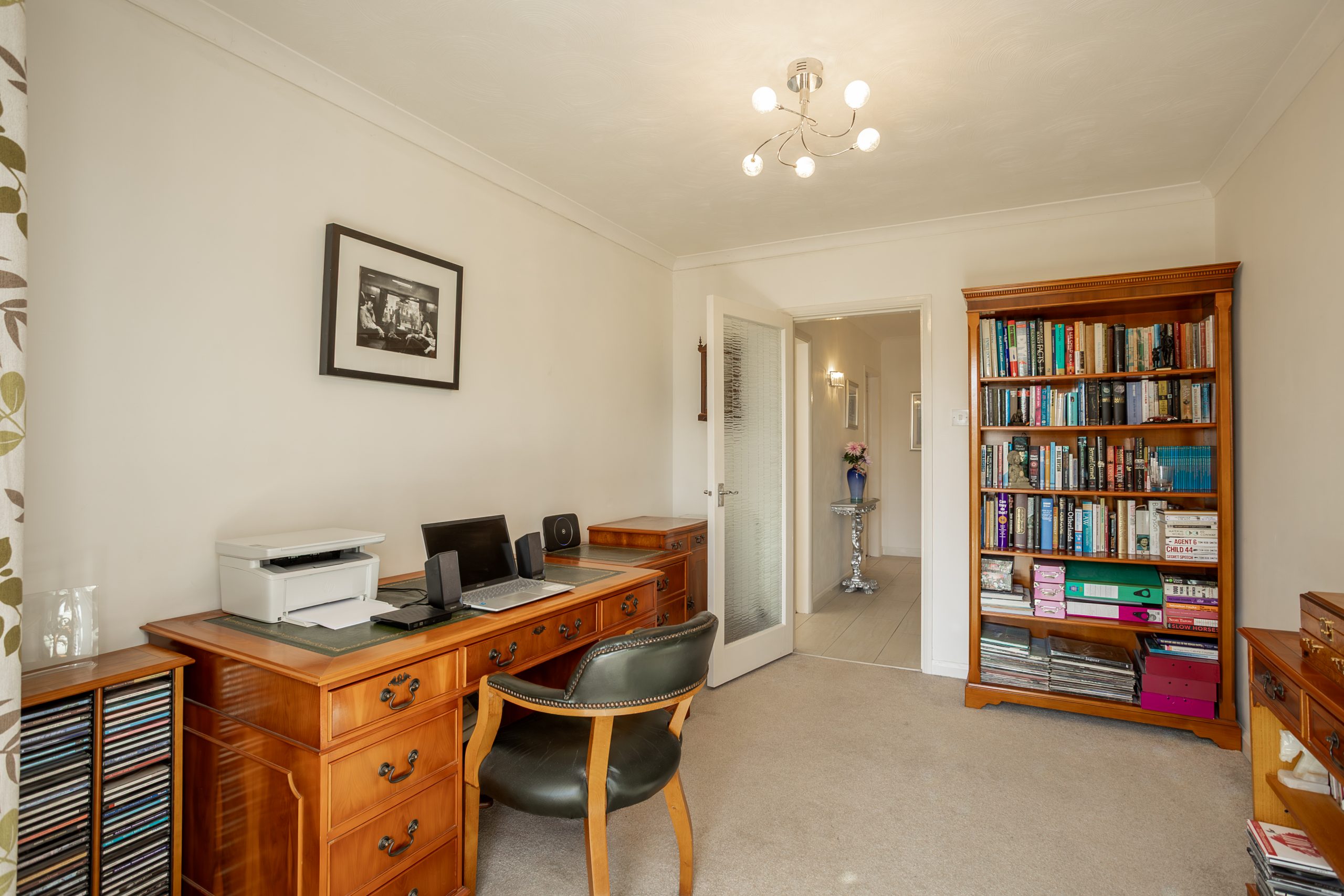There are three double bedrooms. The primary bedroom, located at the front of the house, includes built-in wardrobes and a stylish, recently refitted ensuite shower room. The second double bedroom, situated at the rear, also features built-in wardrobes and a dressing table. The third bedroom is currently used as a home office and has access to the orangery, providing flexibility for various needs.