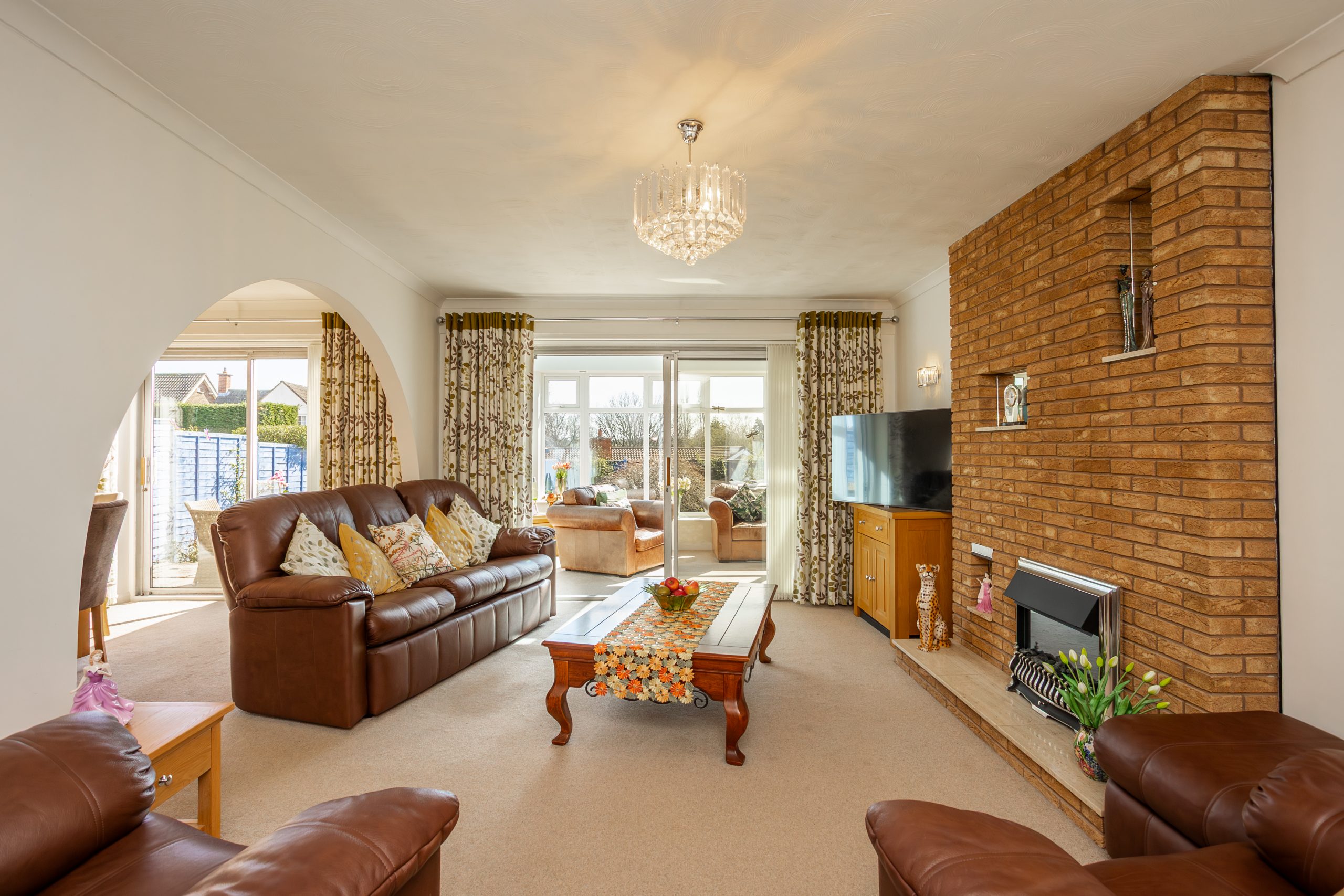 The open-plan living and dining room is a bright, inviting space situated at the rear of the property. It can be accessed from the hallway or kitchen. The living area features a cosy brick fireplace with an electric fire, and an archway connects it to the dining area, which benefits from patio doors opening to the garden. The orangery, a beautifully designed and generously proportioned addition, offers a versatile living space. It boasts an impressive roof lantern, creating a light-filled environment ideal for relaxation or entertaining.