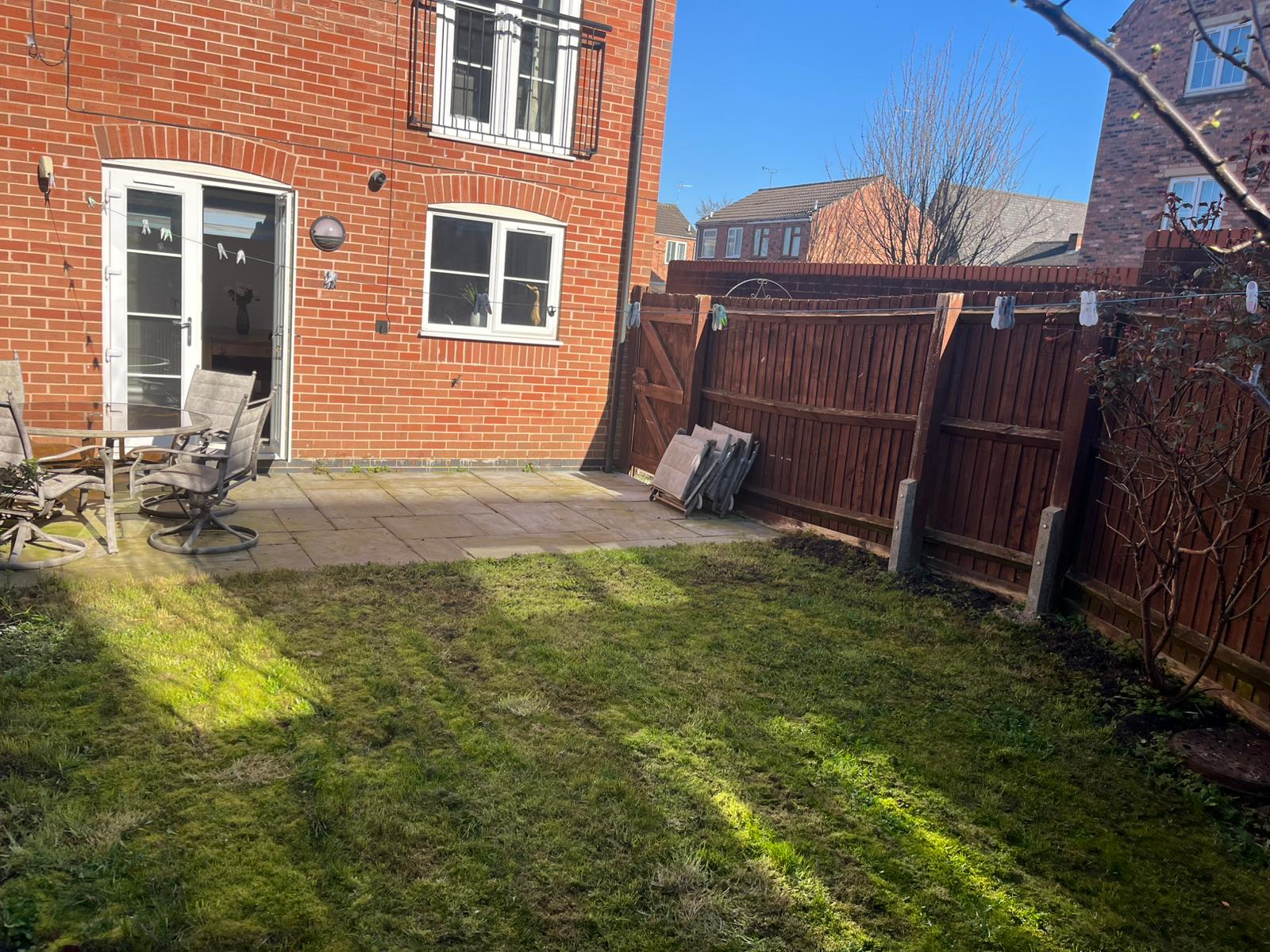 The property benefits from a low-maintenance rear garden, featuring a patio area directly accessed through the French doors from the kitchen-diner — perfect for outdoor dining or relaxing. Beyond the patio, the garden is laid mainly to lawn, offering a practical and versatile outdoor space. A side access gate provides convenient entry to and from the property.