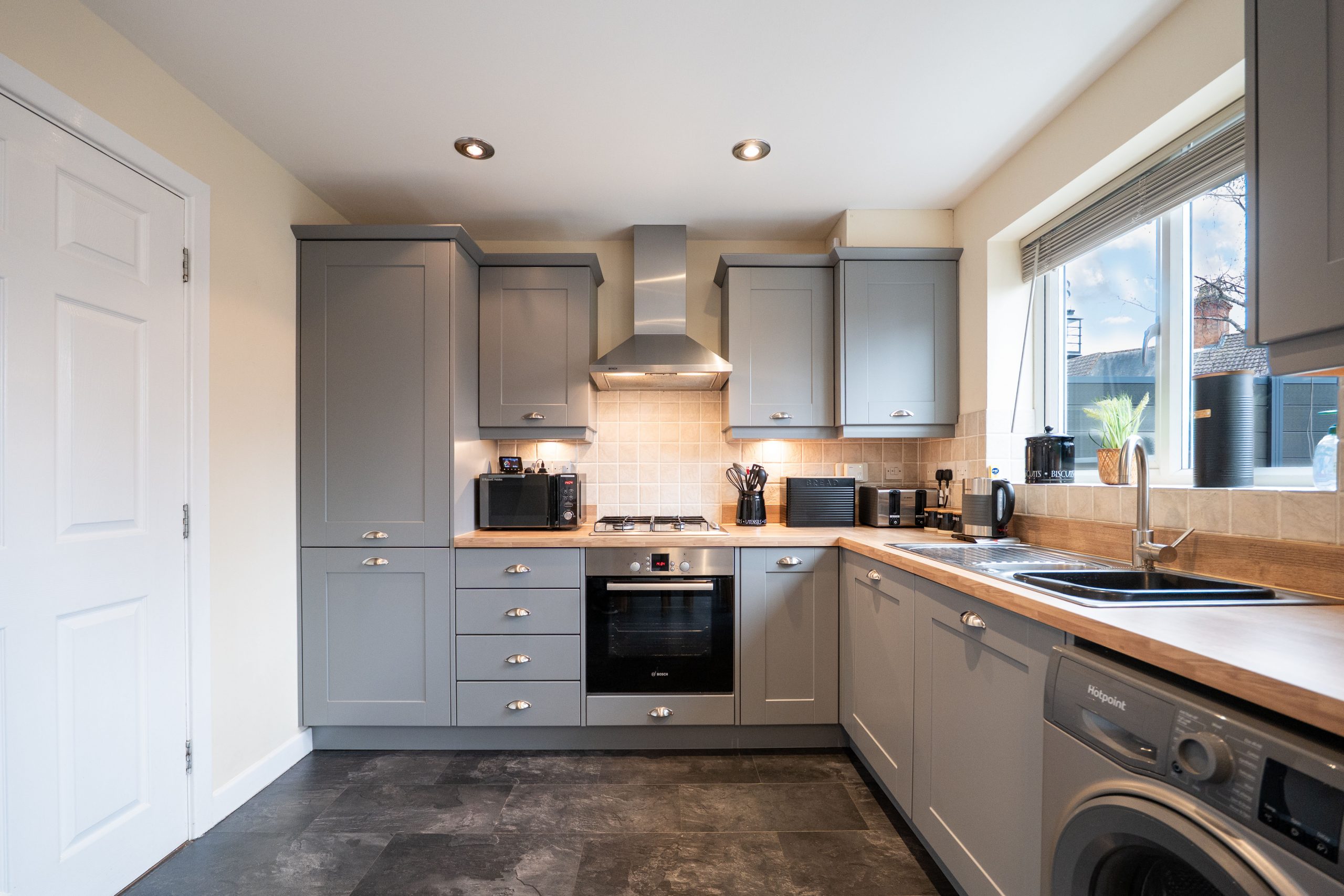 You’re welcomed into a bright and spacious hallway, enhanced by warm wooden flooring that immediately sets a stylish and inviting tone. Cleverly positioned beneath the staircase is a contemporary W.C., offering everyday convenience while maintaining a clean and uncluttered feel. To the rear of the home, the hallway opens into a beautifully designed kitchen diner, thoughtfully arranged to suit modern living and spanning the entire width of the home. The kitchen recently fitted in August 2023 by Dream Doors features a range of integrated appliances, including a gas hob, oven, extractor fan and dishwasher, with additional space for a washer/dryer and a fridge freezer (current one included in sale). Grey shaker style units with sleek metal handles pair perfectly with the butcher’s block effect worktops, while dark grey floor tiles tie the whole space together with a cohesive, elegant finish. French doors at the rear flood the room with natural light and open directly onto the patio, creating a seamless connection between indoor and outdoor living. Whether hosting family meals, entertaining friends, or enjoying a quiet morning coffee, this space offers both practicality and charm in equal measure.