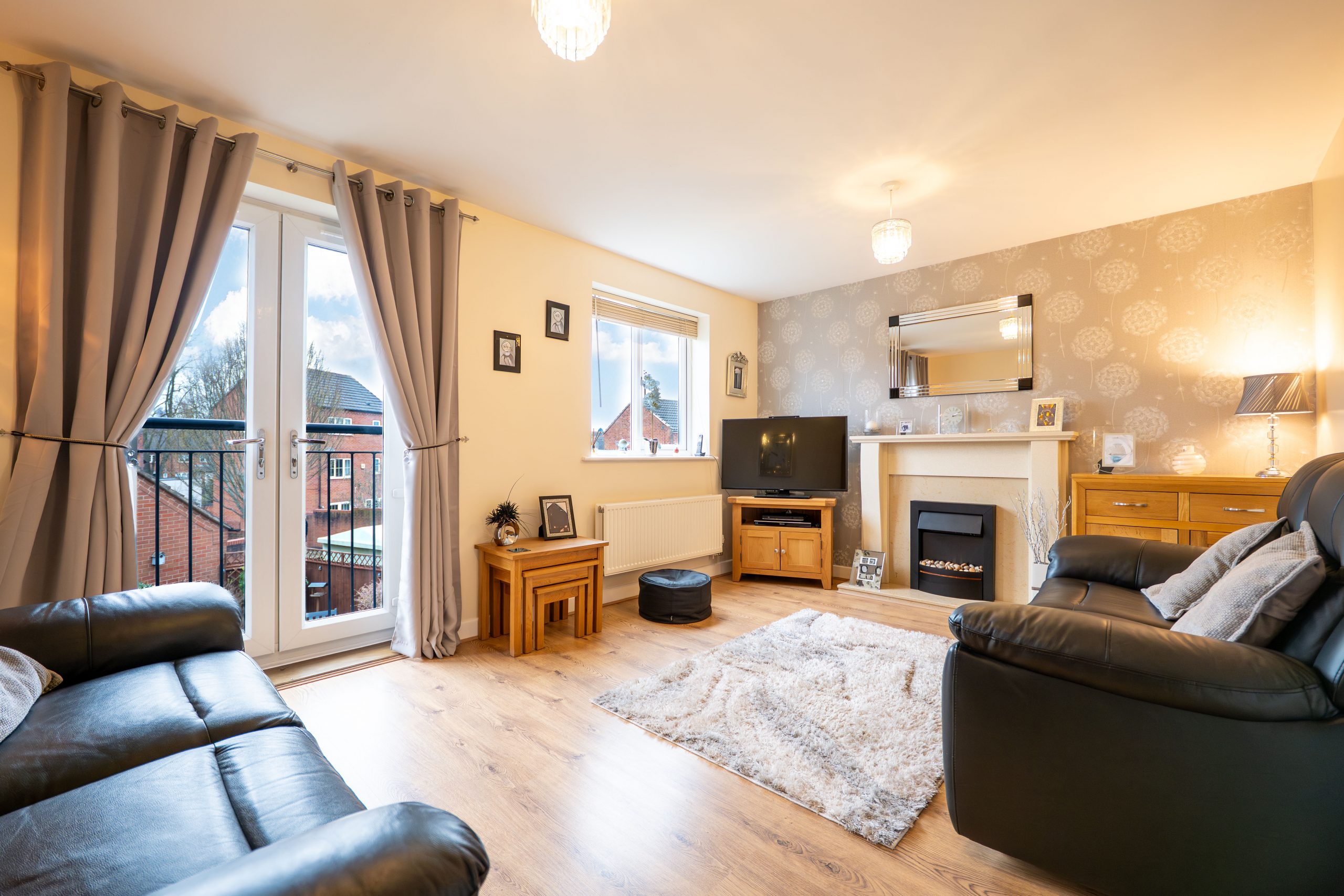 The first floor is finished with soft grey carpeting throughout, creating a warm and cohesive feel as you arrive on the generous landing. The first room you come to is the lounge, a bright, inviting space that spans the full width of the property. It features elegant glass double doors with a Juliet balcony overlooking the rear garden, along with an attractive fireplace and wooden flooring that add both character and comfort. Further along the landing, the family bathroom offers a practical white three piece suite with a shower over the bath. Neutral beige tiling and wood effect flooring give the room a clean, timeless finish. Completing this level is a well proportioned double bedroom positioned at the front of the home, enjoying plenty of natural light from its front facing window and offering ample space for furnishings, all complemented by the same wooden flooring for a seamless look.